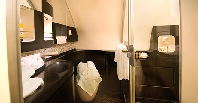 Los afortunados en viajar en primera disponen también de un amplio baño y de kit de aseo con productos de Armani.