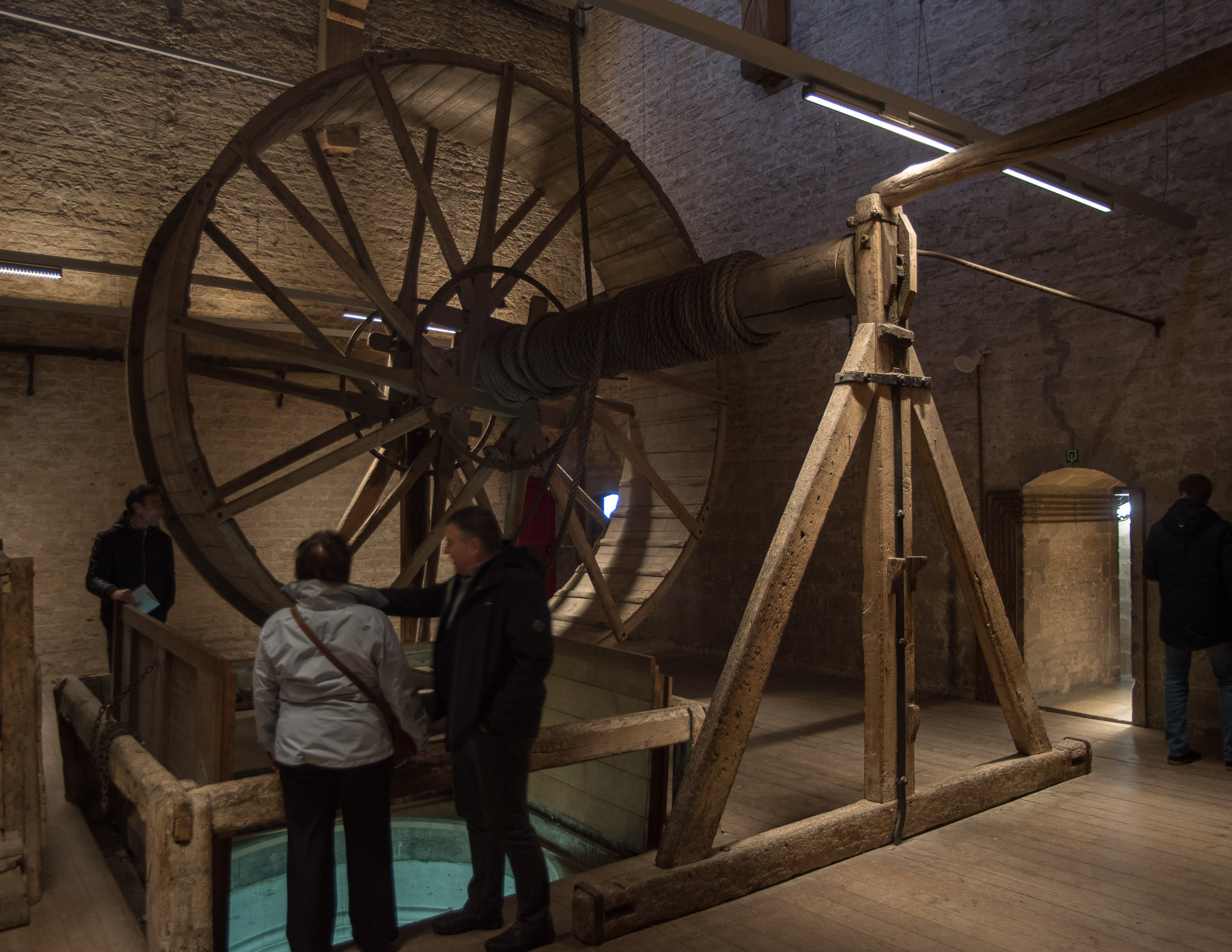 La subida a la torre de la Catedral tiene 500 empinados escalones, pero hay varias salas durante la subida que nos permiten descansar. En una se encuentra esta antigua grua