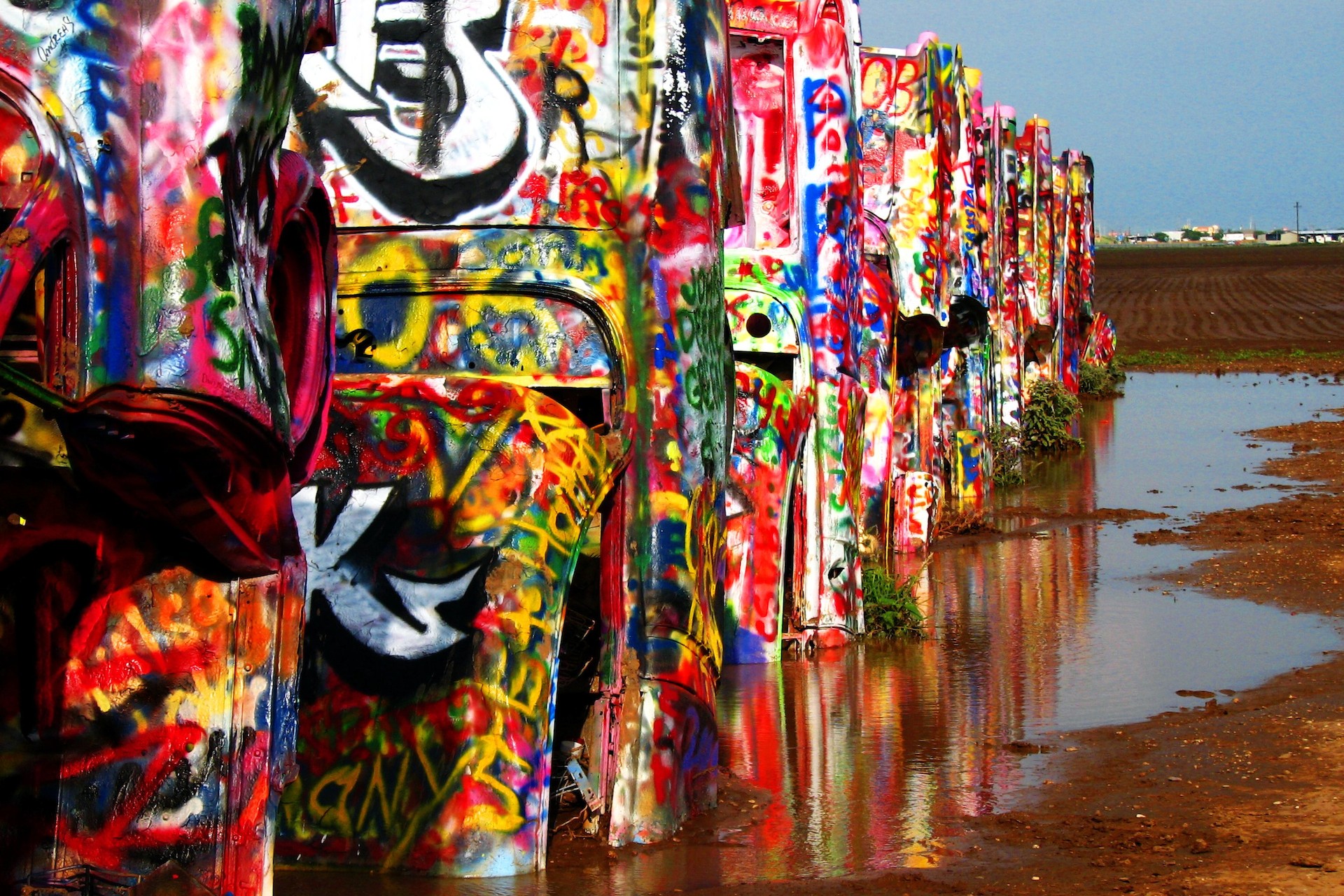 El Cadillac Ranch es un lugar que fomenta grafitear o pintar con spray múltiples coches Cadillac que se encuentran incrustados en la tierra en Amarillo, Texas.