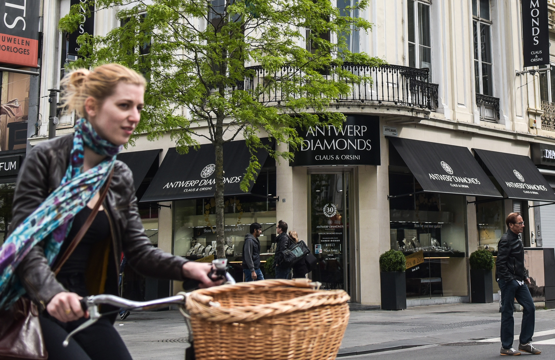 Una mujer pasea con su bicicleta por la calle Appelmans Straat, en la esquina el establecimiento Antwerp Diamonds, muy cerca del barrio del diamante en Amberes.