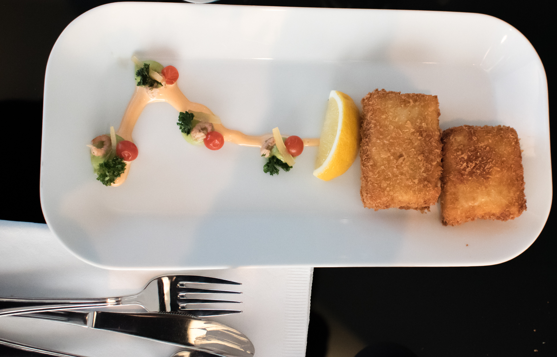 Además de sus famosos mejillones, en este restaurante es posible degustar unas generosas croquetas rellenas de gambas, también típicas.
