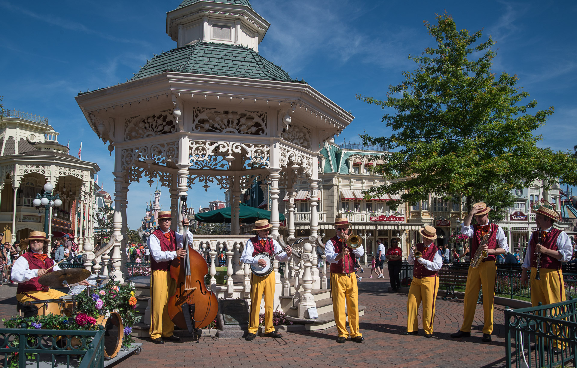 Un pequeño grupo de músicos recibe a los visitantes a la entrada del parque