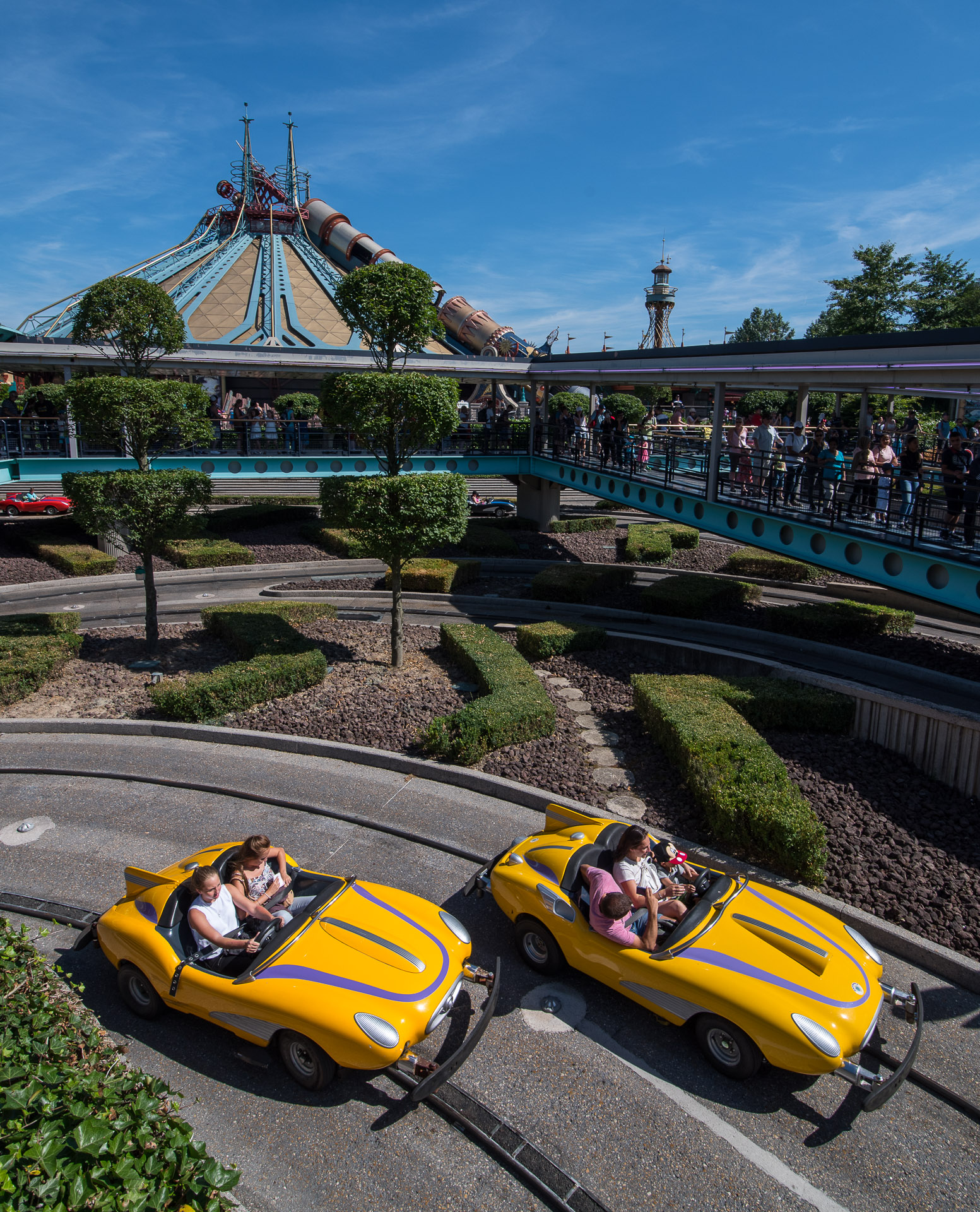 Autopía es una de las atracciones más populares. Al fondo, Space Mountain, al fondo, una de las más conocidas montañas rusas