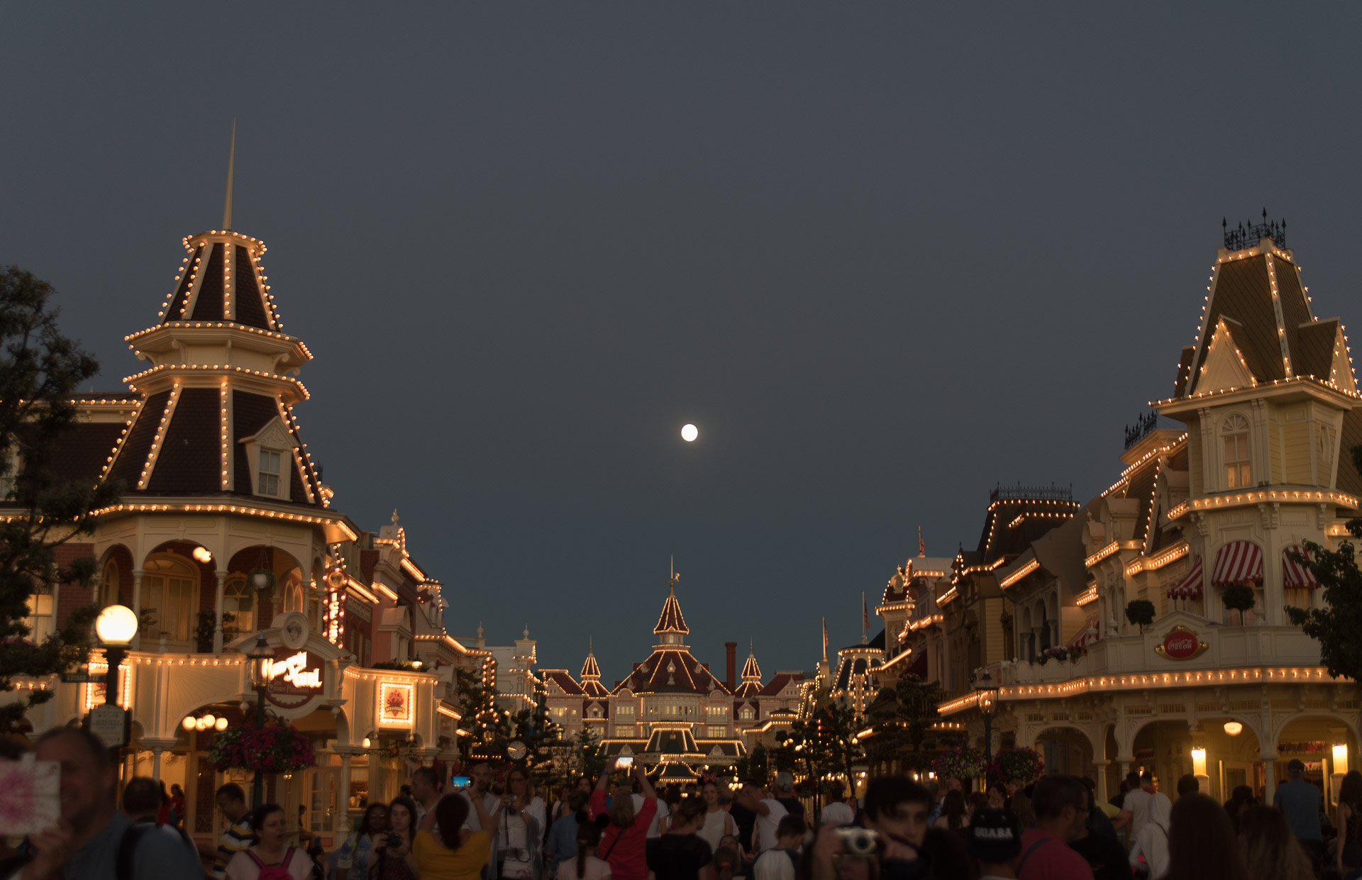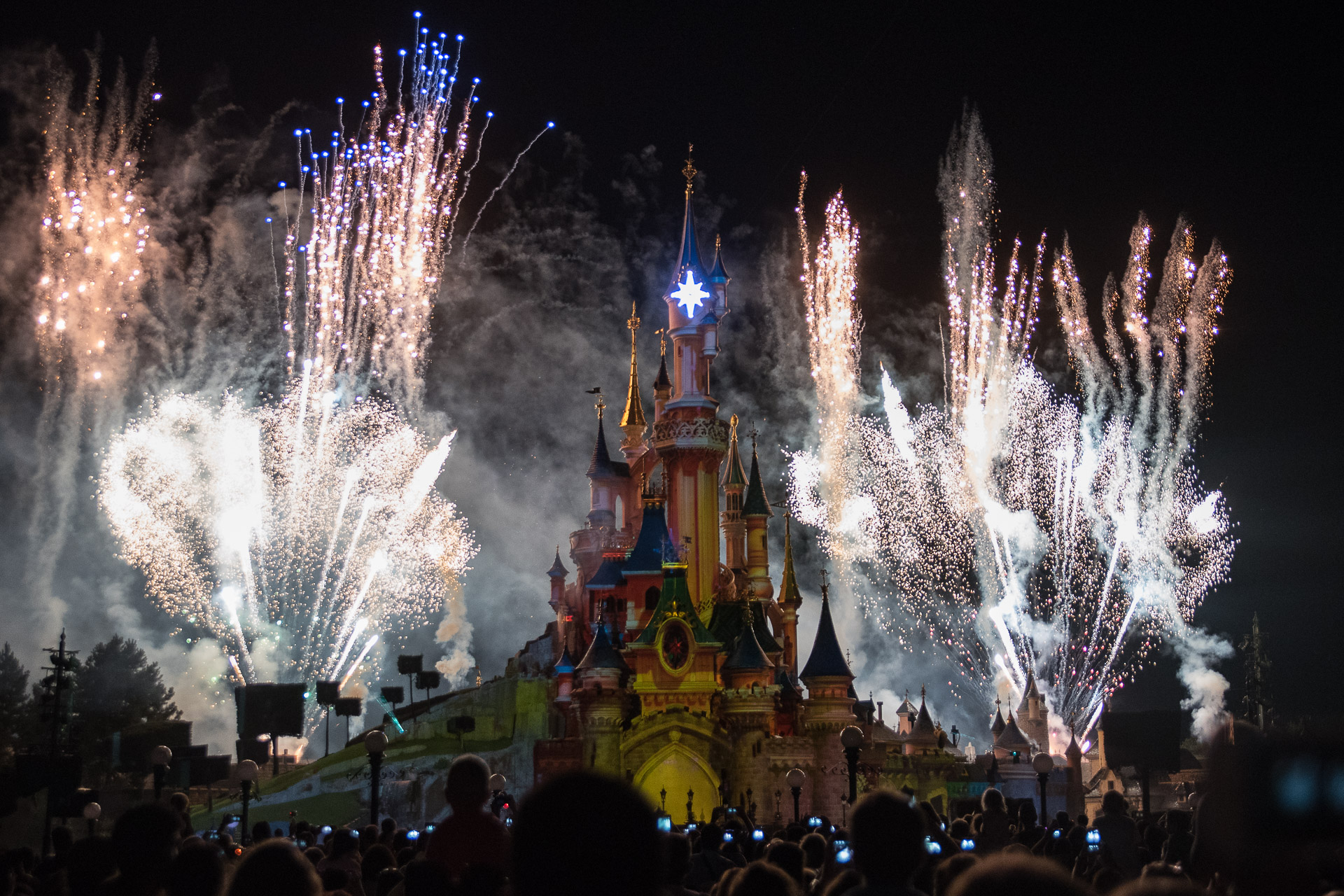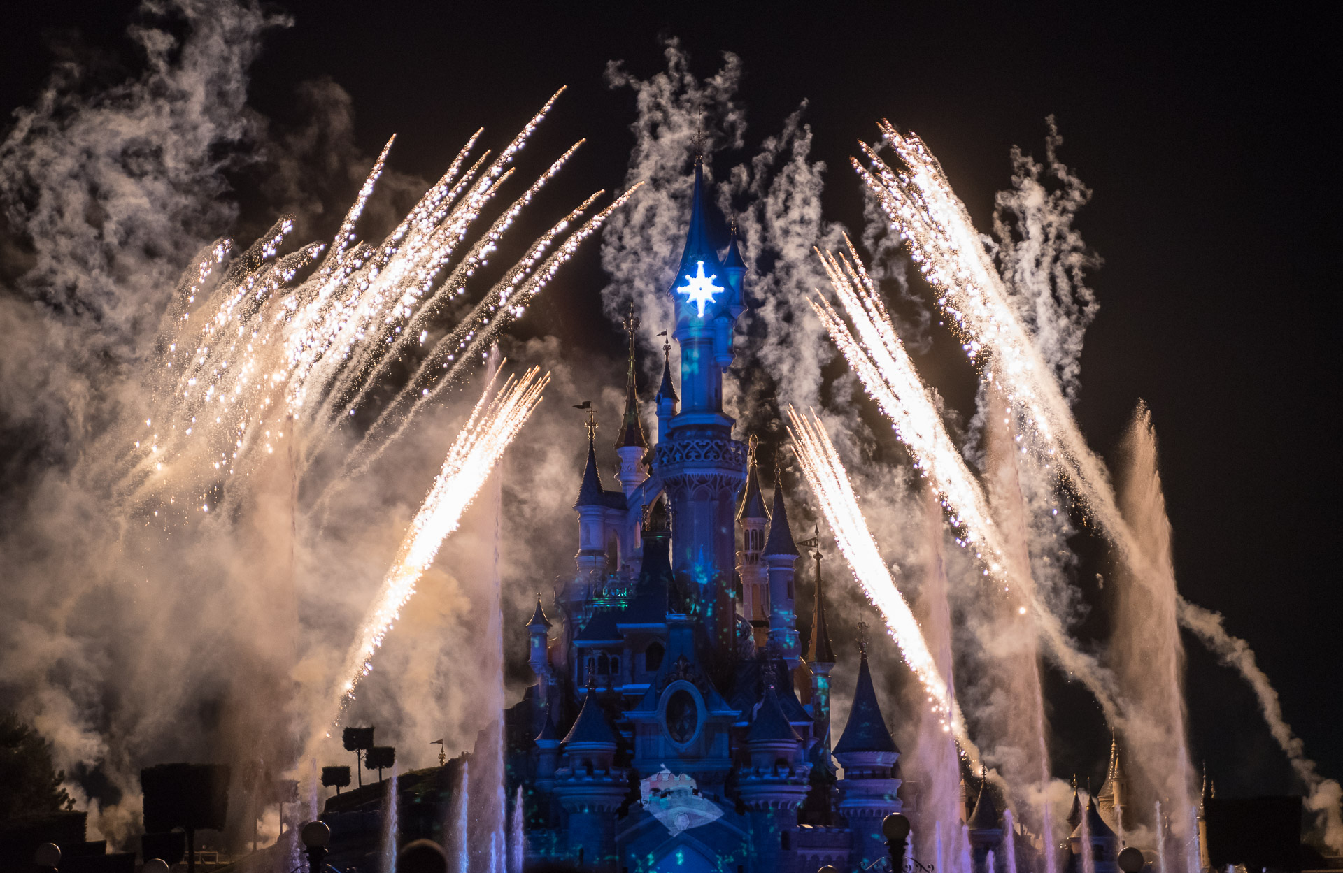 El espectáculo nocturno incluye fuegos artificiales, imágenes proyectadas sobre el castillo, fuentes...