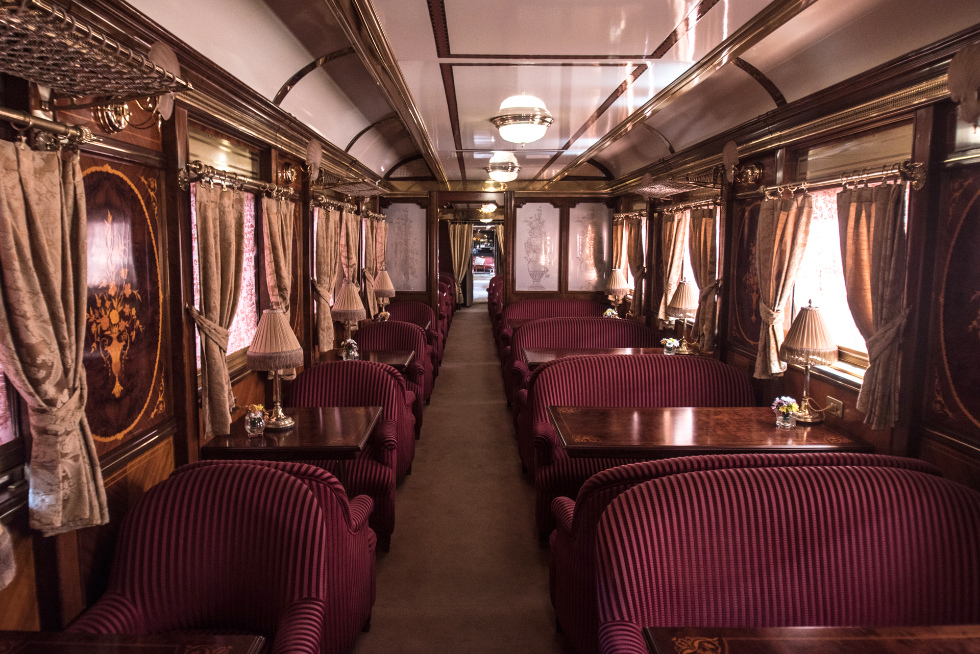 Uno de los vagones comedor decorado al estilo de la época, con detalles art decó, que ha mantenido los maleteros de la parte superior tal y como estaban su su día.