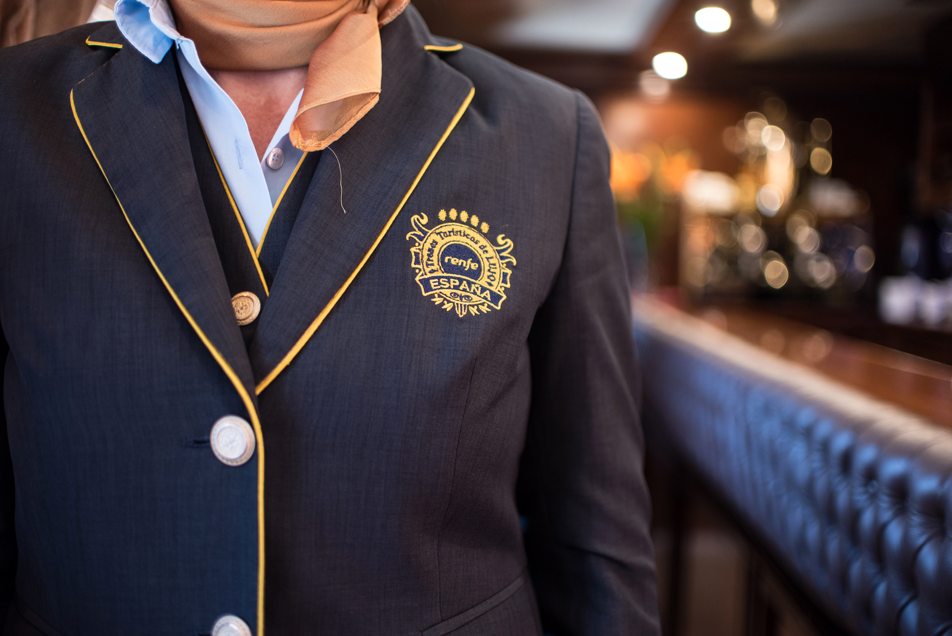 La indumentaria y los uniformes de la tripulación son diseñados con el escudo del tren de lujo de Renfe.