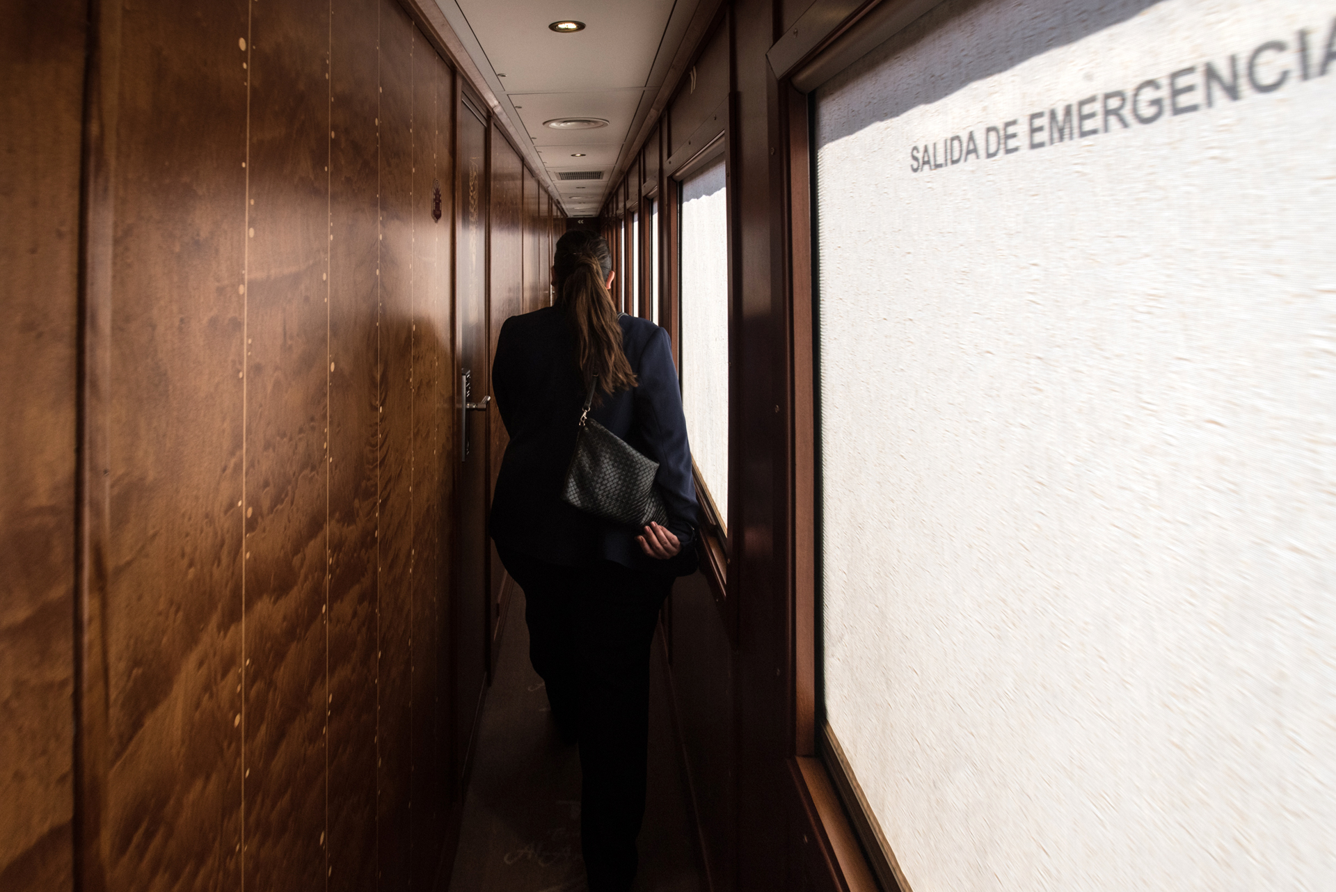 Una de las azafatas pasea por el interior de uno de los vagones del tren Al-Ándalus.