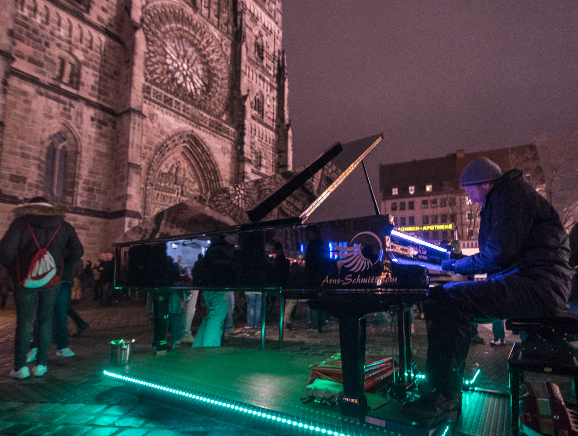 El Mercado se amplía cada vez a más aspectos y, por supuesto, es también una cita cultural con conciertos -sobre todo de música navideña en las bellas iglesias del casco viejo- y también con actuaciones más improvisadas como la de este pianista que actuaba frente a la iglesia de San Leopoldo