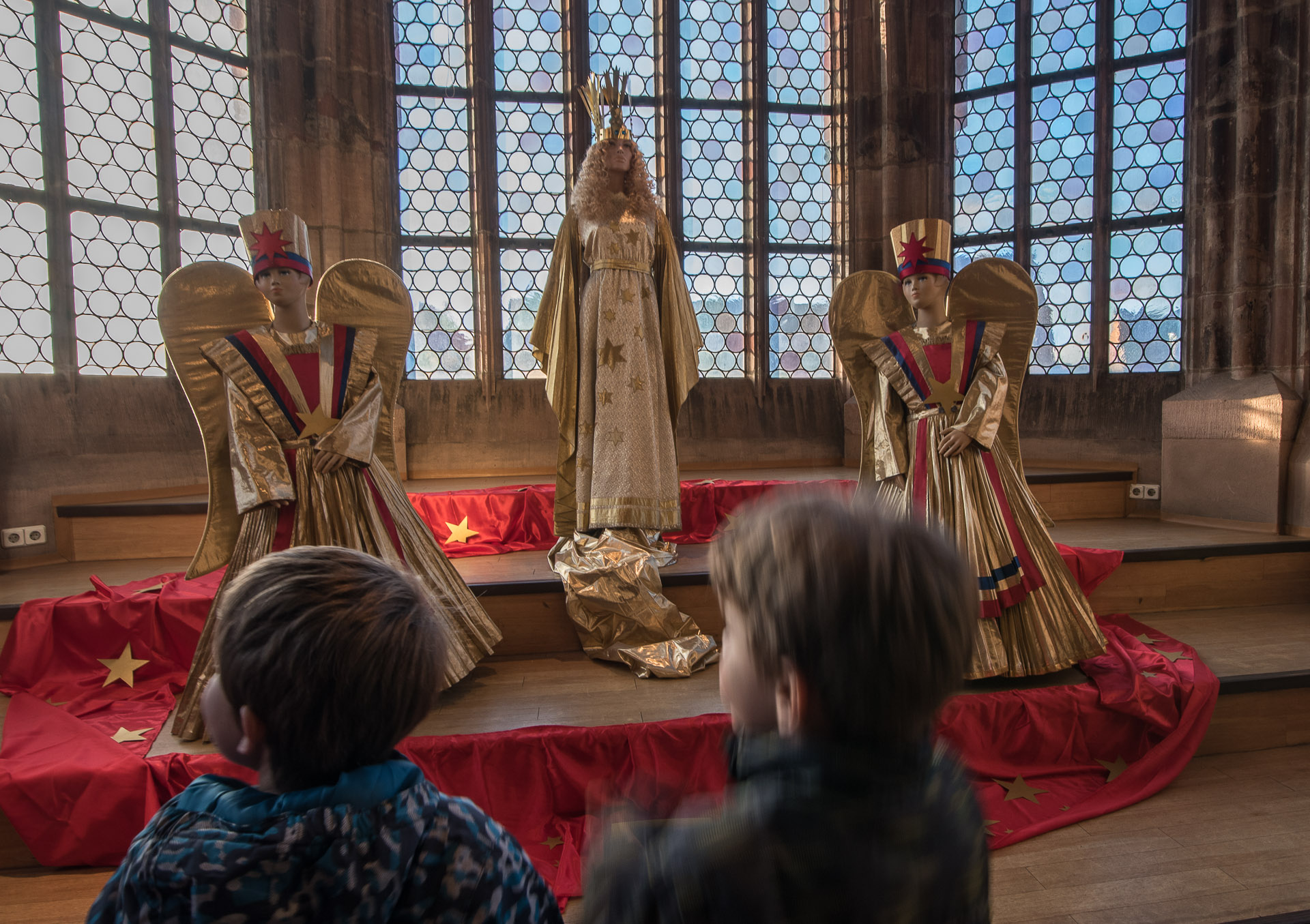 El Mercado se inicia con la llegada del Ángel de la Navidad, un curioso personaje -Christkind, en alemán- que representa una joven de la ciudad elegida por un exigente jurado y que representa un papel con un cierto parecido al de una Fallera Mayor. En la imagen dos niños contemplan un maniquí ataviado como el Ángel en la iglesia de Nuestra Señora, desde la que "aparece" el viernes antes del primer sábado de adviento