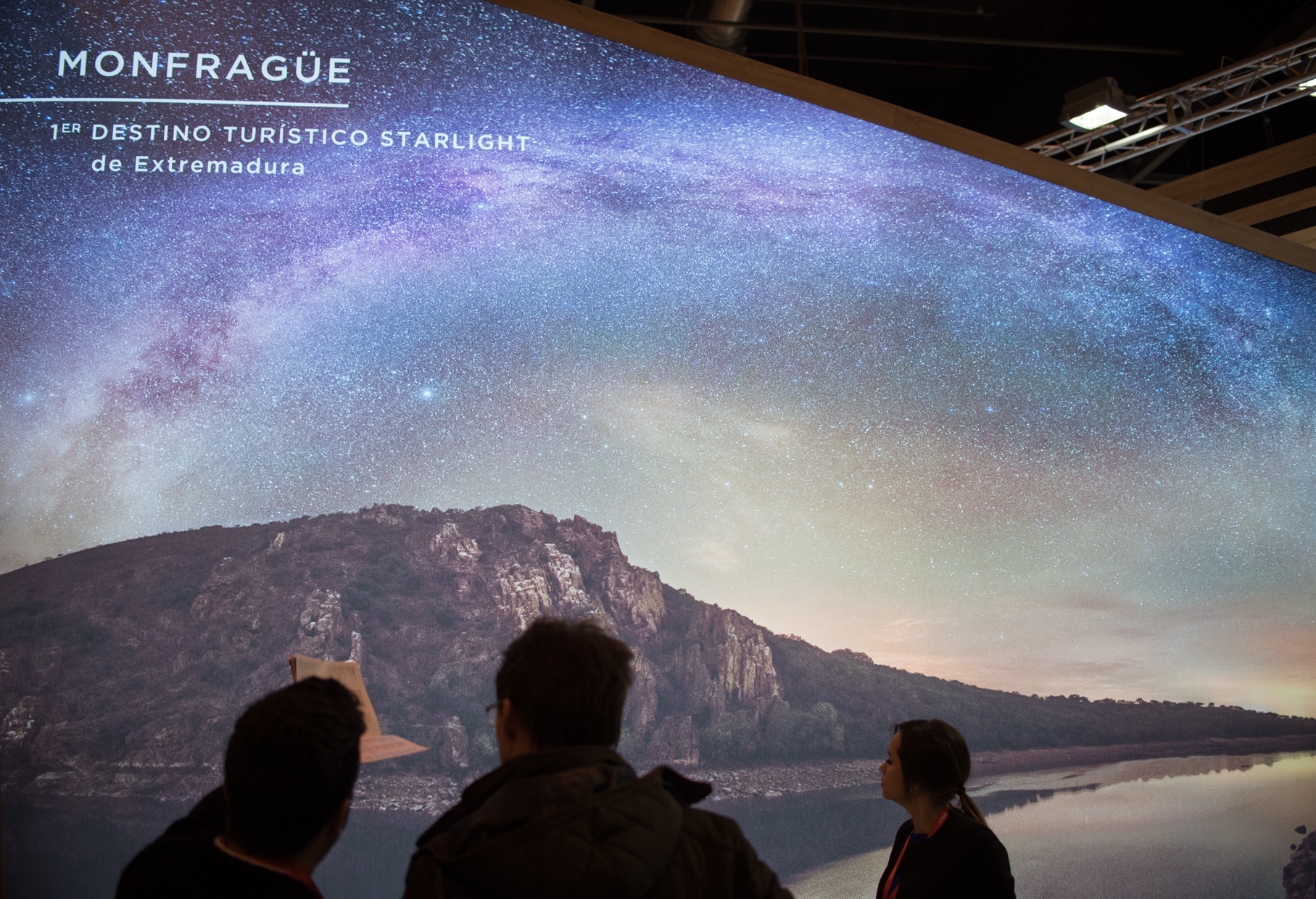 En el stand de Monfragüe se puede ver un enorme cartel luminoso con un espectacular cielo estrellado. Extremadura promociona este destino turístico 'starlight'.