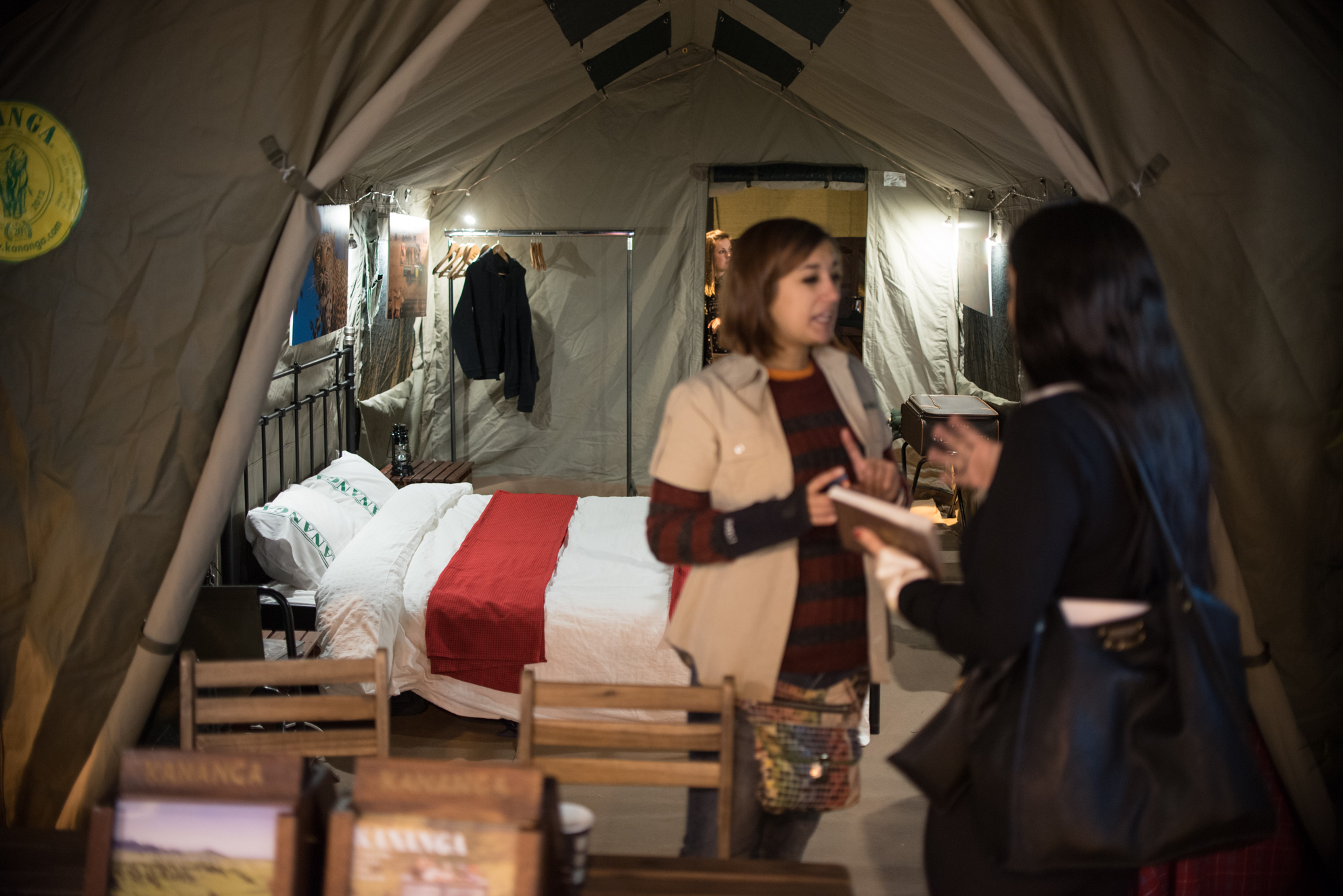 Original stand de la agencia de viajes Kananga. Una tienda de campaña, con cama incluida, pensada para safaris o viajes al continente africano.