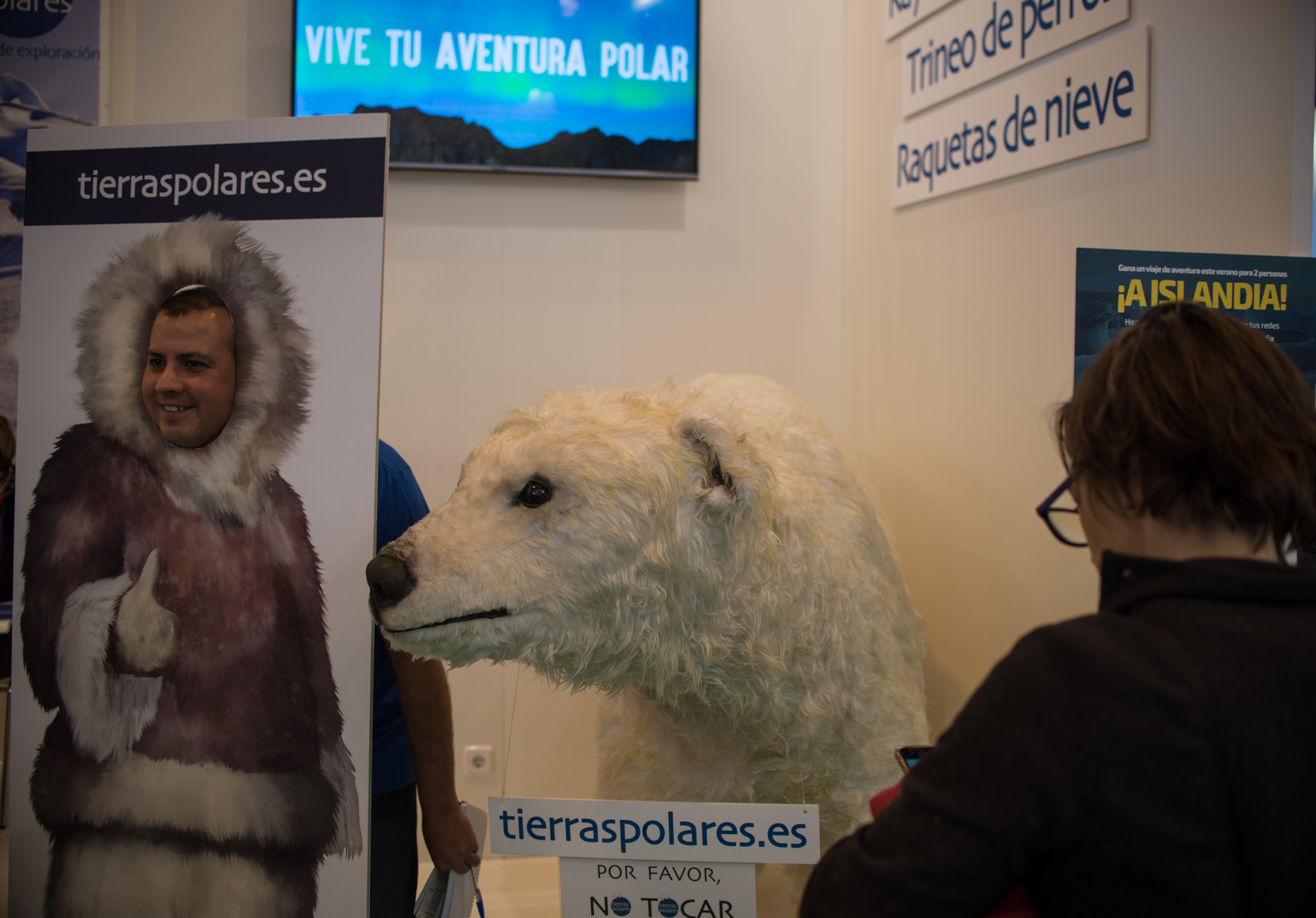 Aventuras en tierras polares. Uno de los stands que promociona este tipo de viajes tiene un oso polar entre sus empleados.