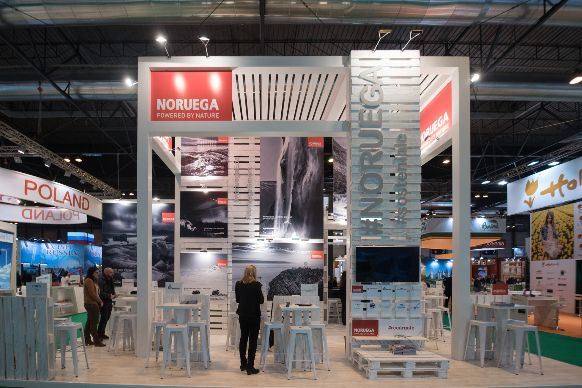 El stand de turismo de Noruega es de diseño. Práctico, no muy llamativo y con una altura considerable. Uno de los destinos de turismo sostenible del 2017.
