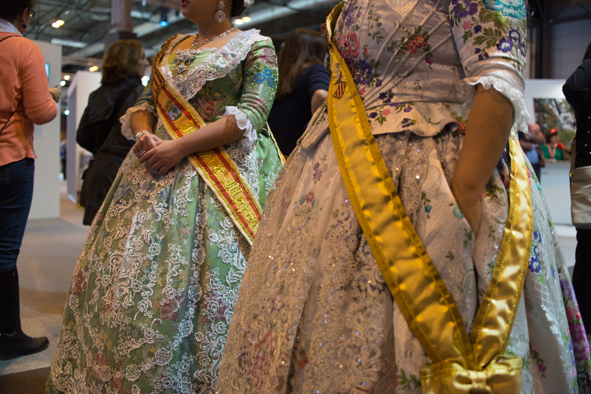 Dos mujeres vestidas de fallera se pasean por la feria de turismo Fitur.