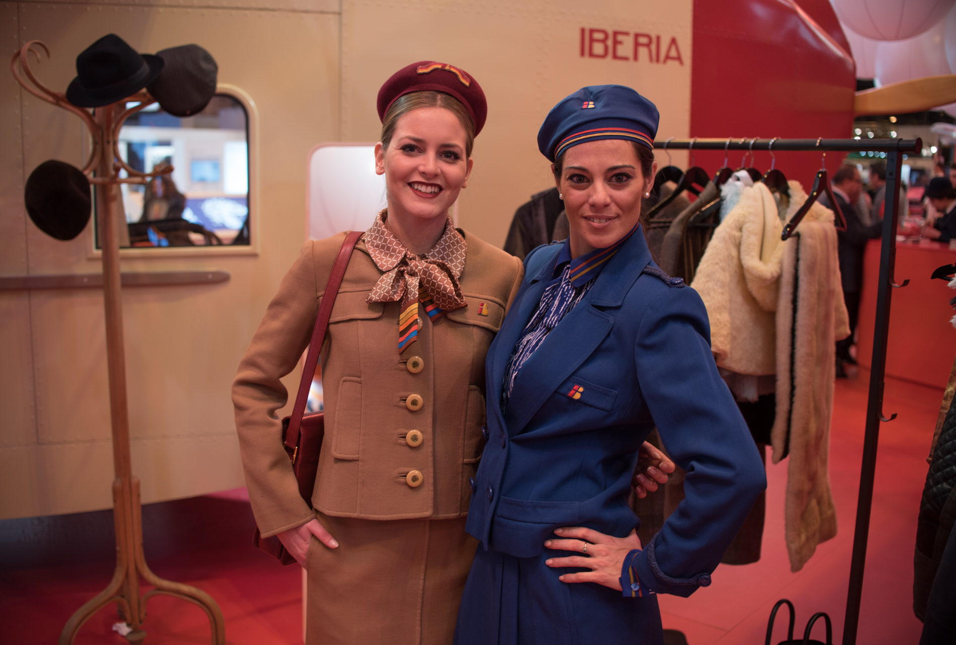 Dos azafatas vestidas con el traje de vuelo del primer avión de la compañia Iberia.