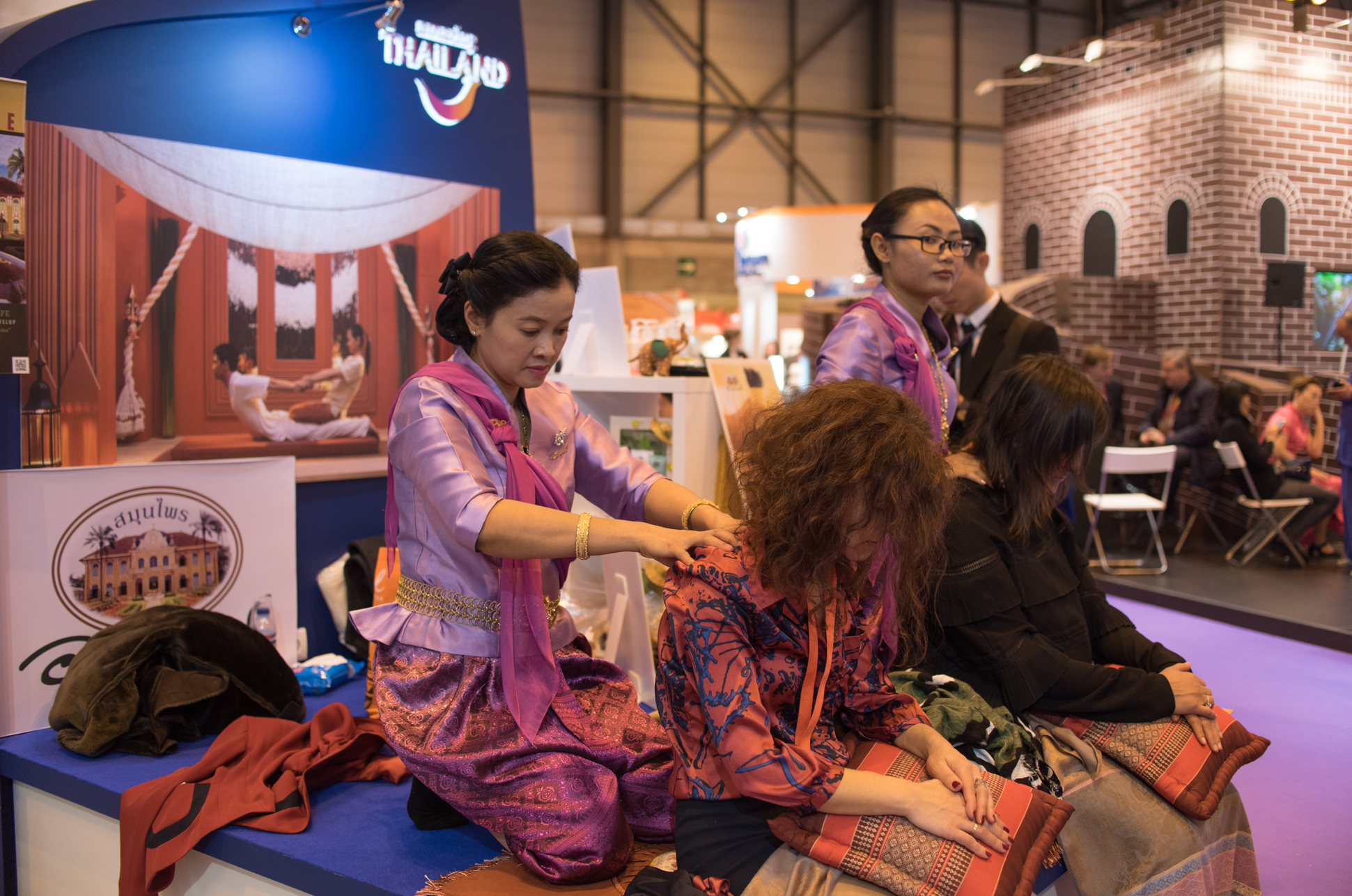 Dos masajistas proporcionan un masaje relajante en el stand de turismo de Tailandia.