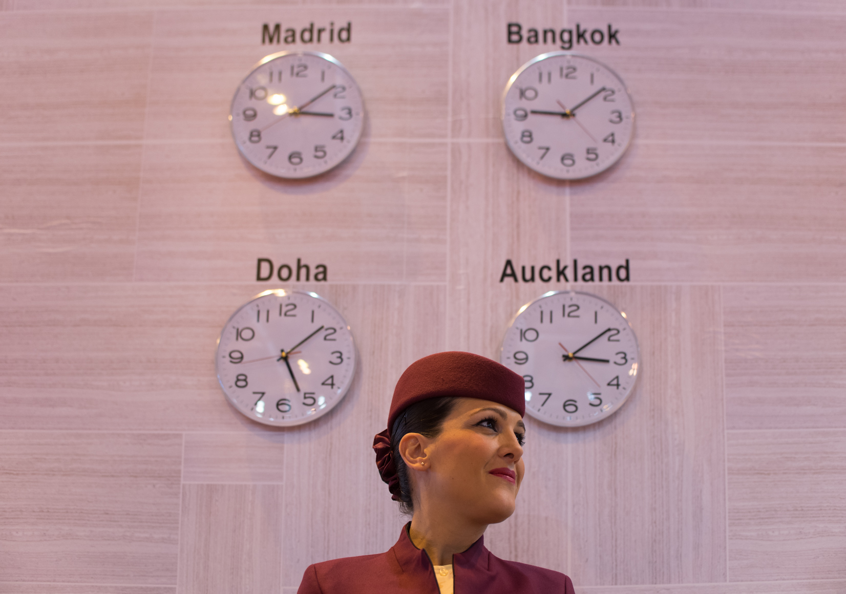 Qatar Airways, una de las mejores aerolíneas del mundo, muestra en su stand varios relojes con las diferentes horas.