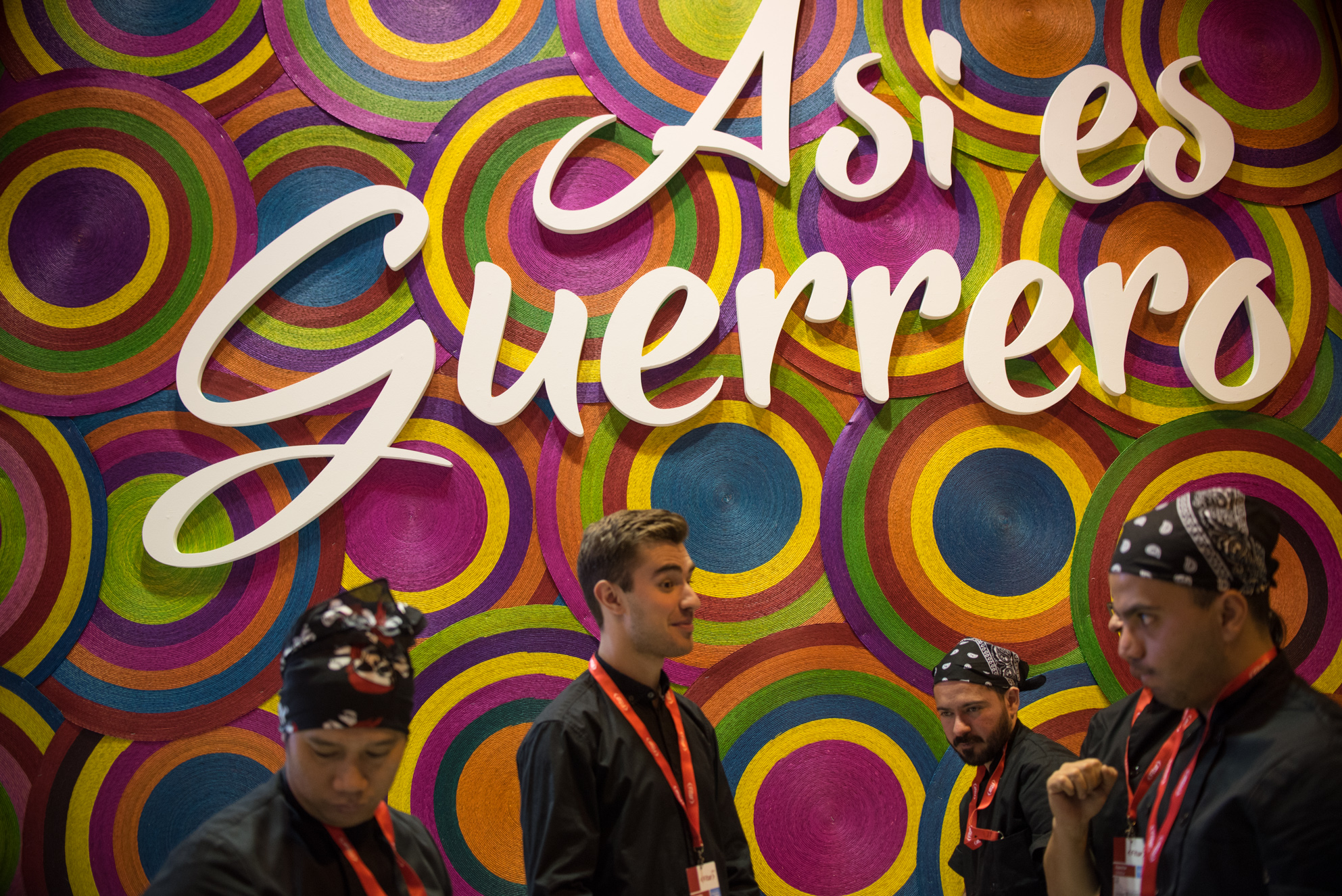 Colorido panel que atrae a los visitantes del stand de turismo de Guerrero, en México.