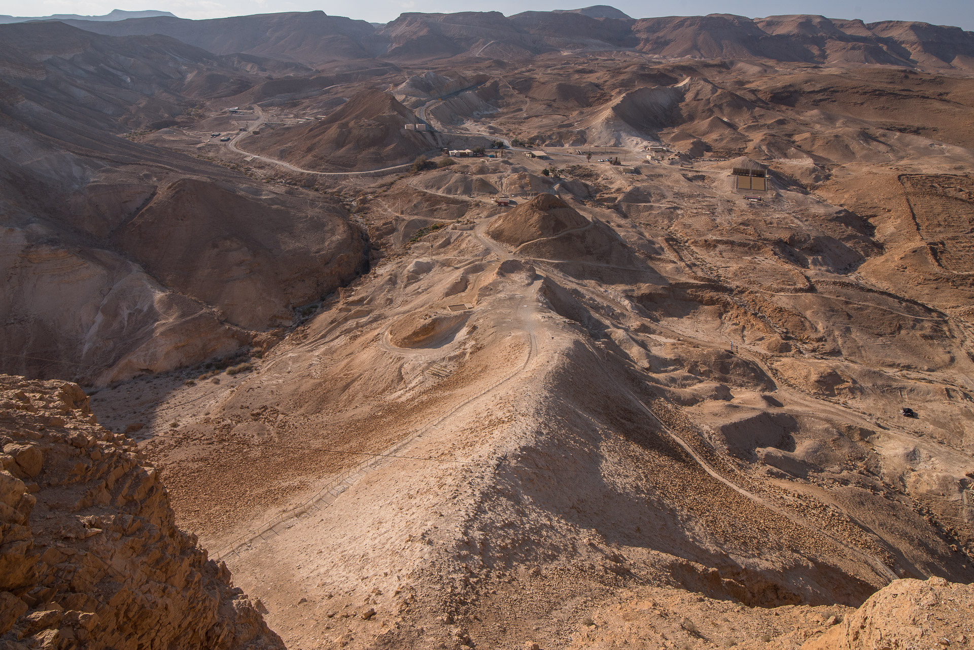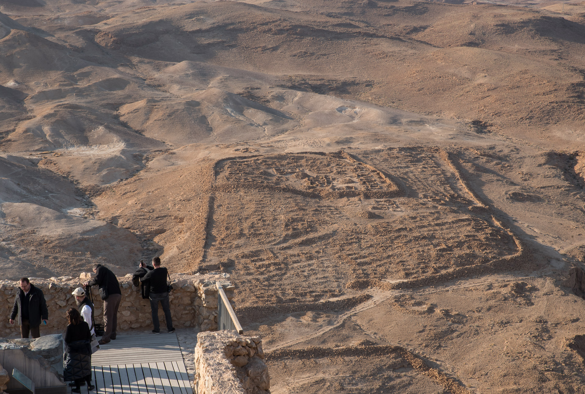 Una vista del principal campamento romano. En la imagen también se puede apreciar el muro que construyeron para encerrar a los sitiados y, por supuesto, el impresionante paisaje del Desierto de Judea
