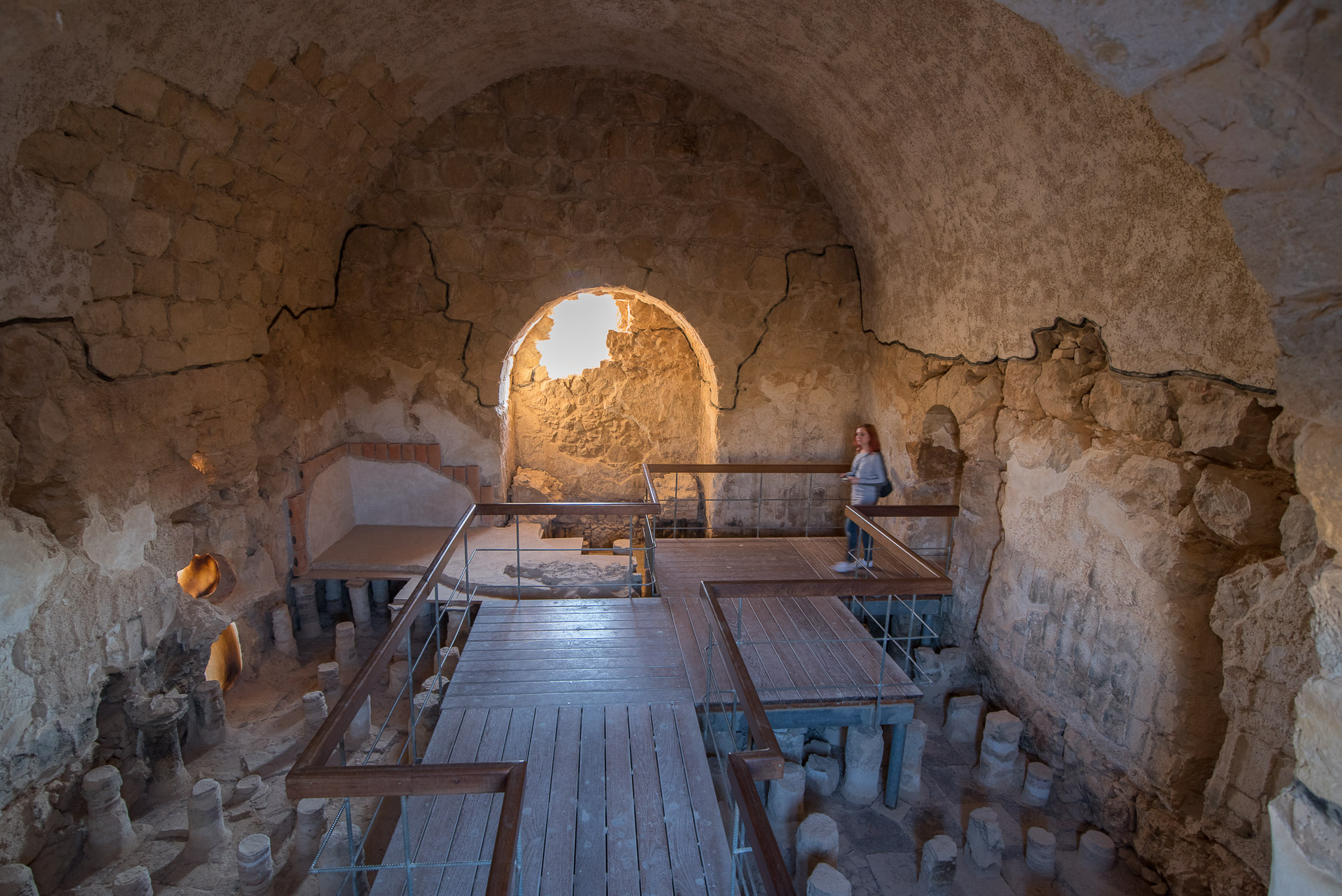 Alguna de las dependencias de la fortaleza, con el Mar Muerto al fondo