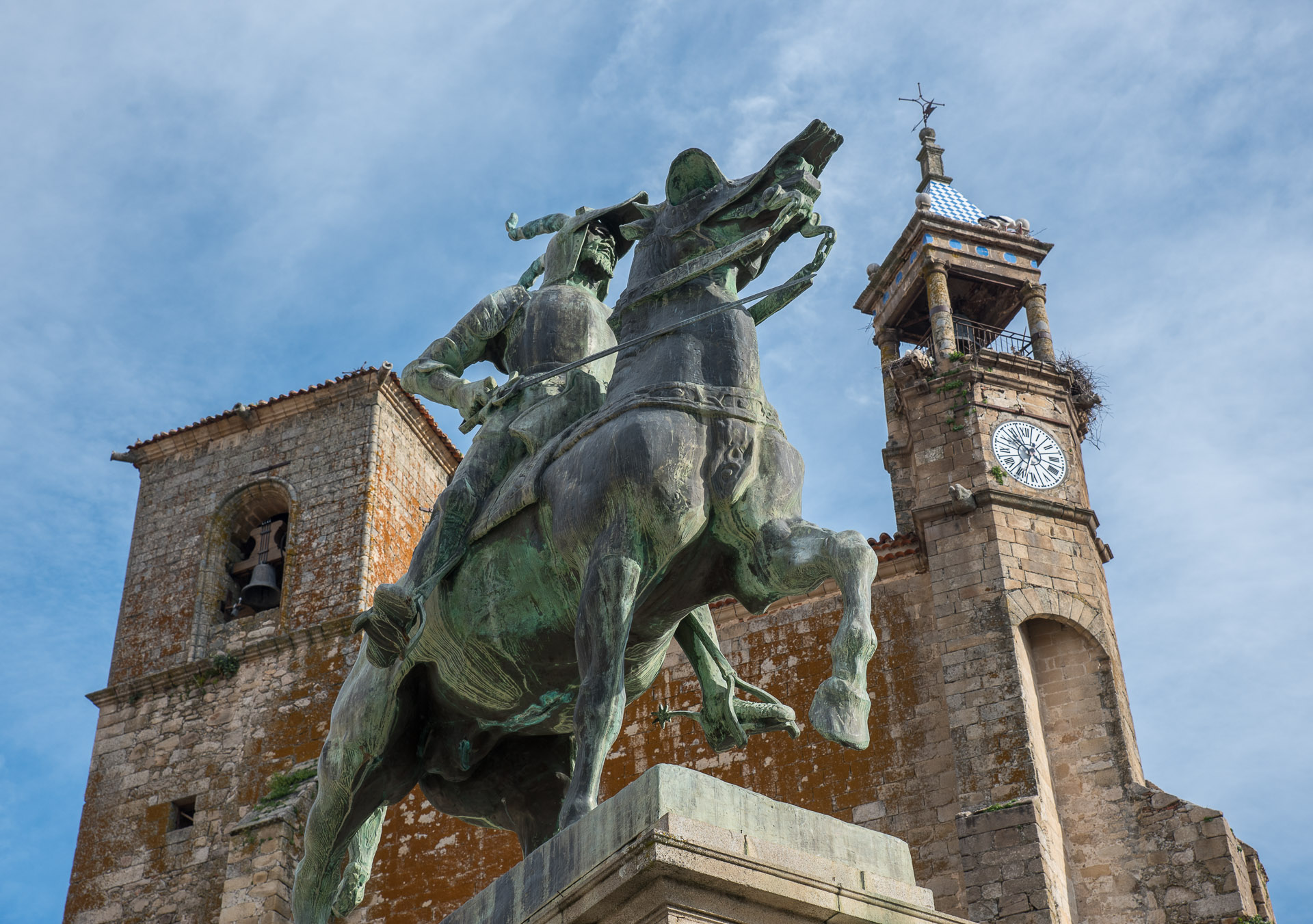 La estatua de Pizarro, el trujillense más conocido, y de fondo los dos campanarios tan diferentes de la Iglesia de San Martín