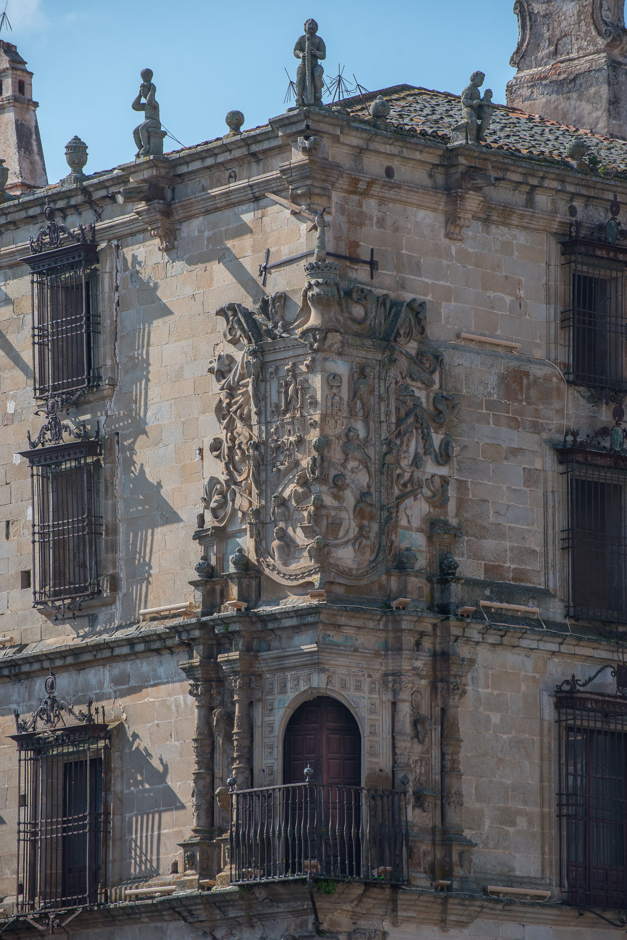 El balcón trujillano y el escudo de armas del Palacio de la Conquista, el impresionante edificio renacentista que construyo Doña Francisca, la hija mestiza de Pizarro