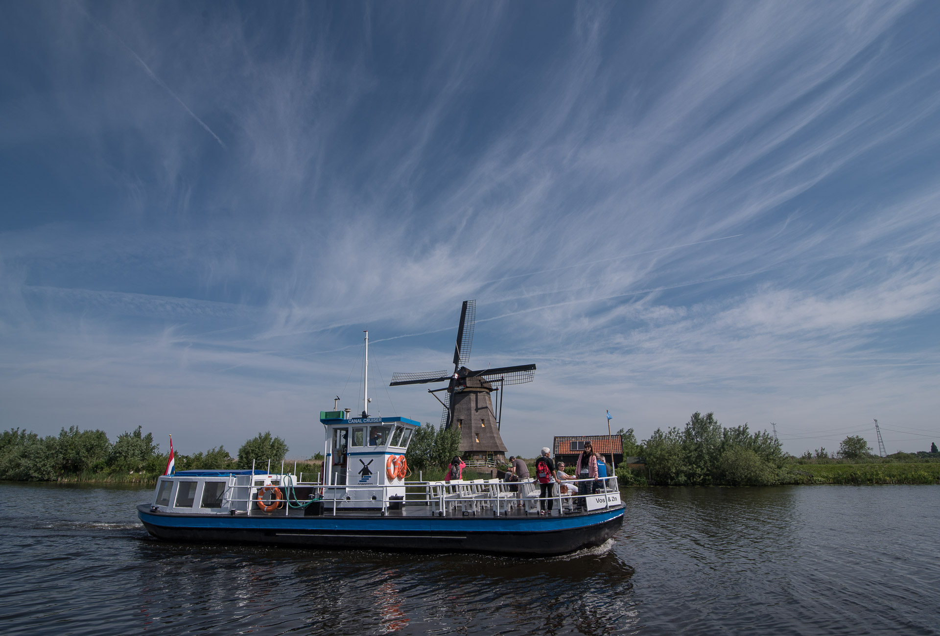 Uno de los molinos del Kinderdijk y un de los barcos que permite recorrer la zona desde el agua