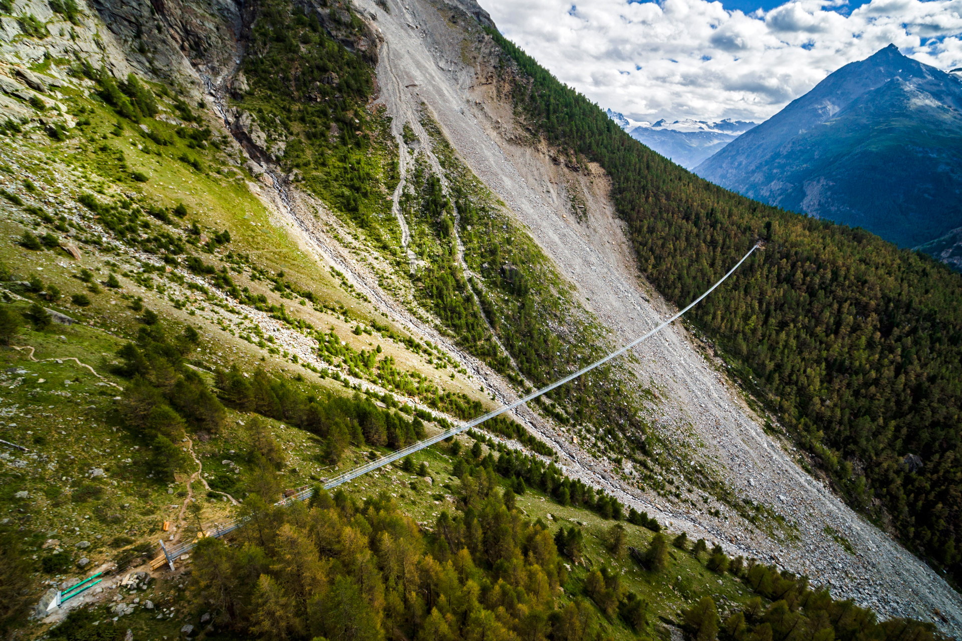 Fue construido en tan sólo 10 semanas, mide 494 metros de largo y su punto más alto es de 85 metros superando al puente colgante en el Gran Cañón de Zhangjiajie, en China. El puente colgante denominado "Europabruecke" fue inaugurado el 29 de julio, para reemplazar un cruce más antiguo que fue dañado por la caída de las rocas. El puente forma parte de una ruta de senderismo entre las ciudades de Zermatt y Grachen, con vistas al legendario monte Cervino.