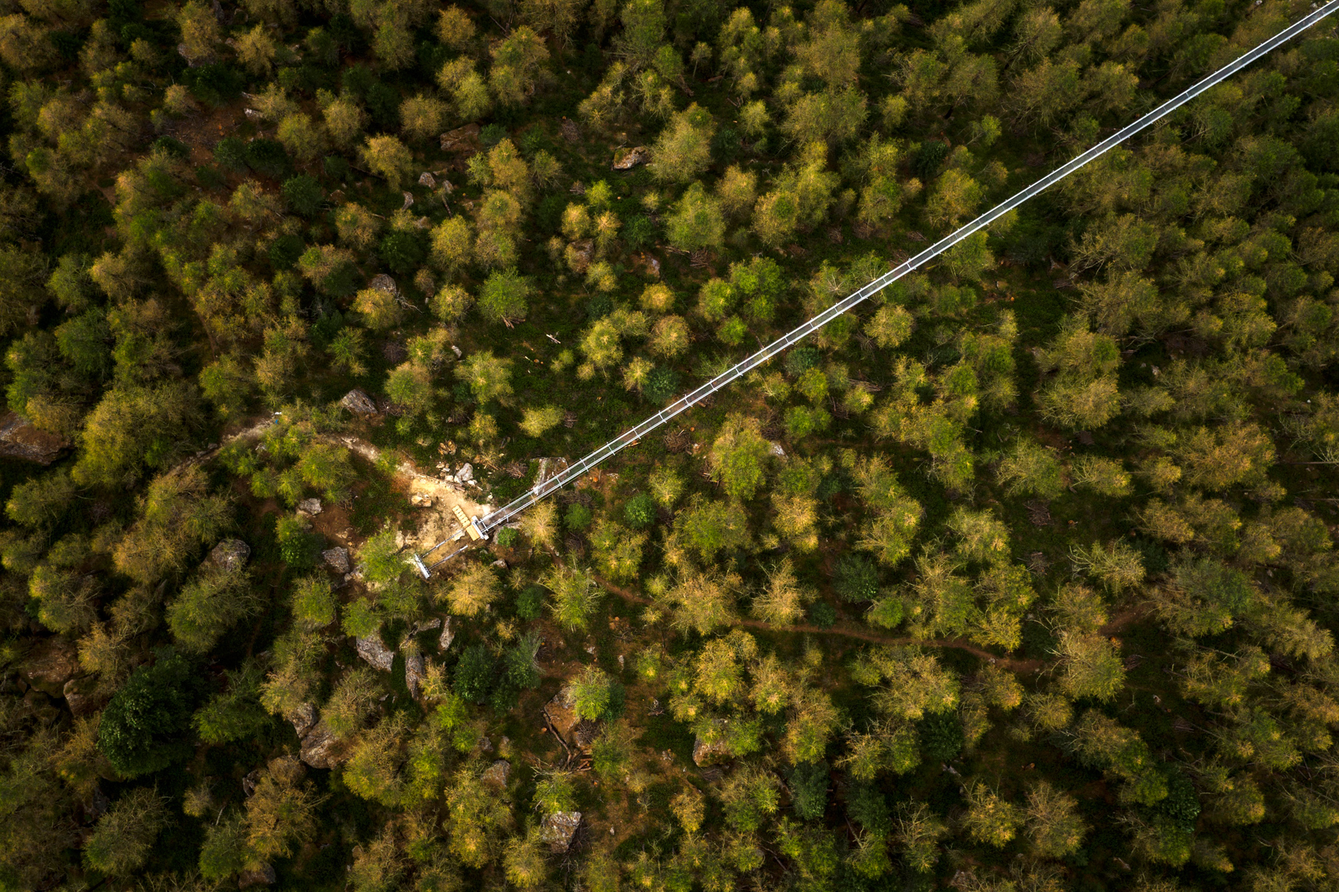 una vista general del puente de suspensión peatonal más largo del mundo con una longitud de 494 metros.