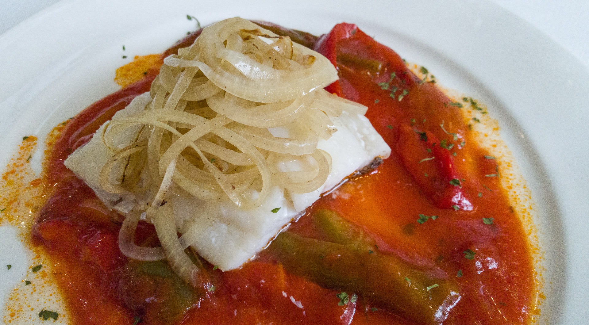 Bacalao con pimientos y cebolla, un ejemplo de la cocina del Hotel Balneario de la Hermida.