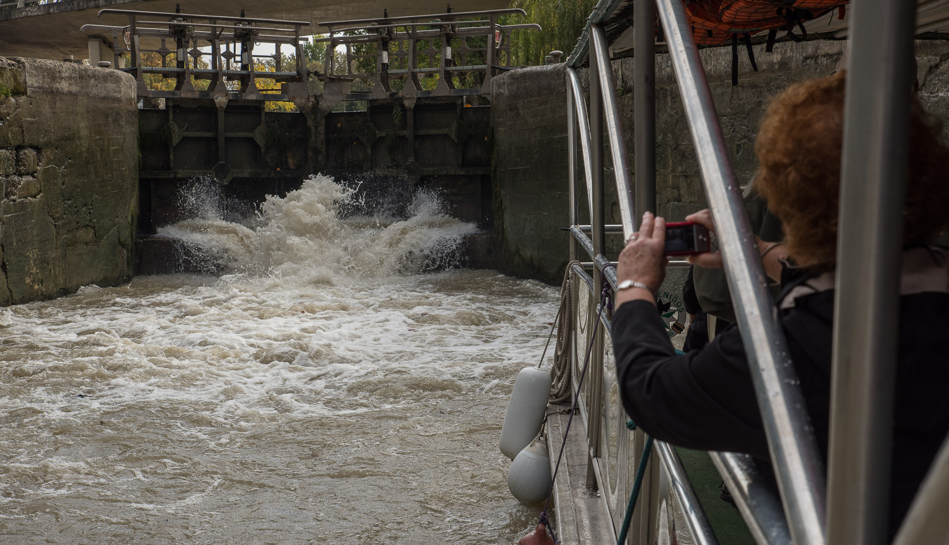 Una turista fotografía el agua entrando torrencialmente en la esclusa
