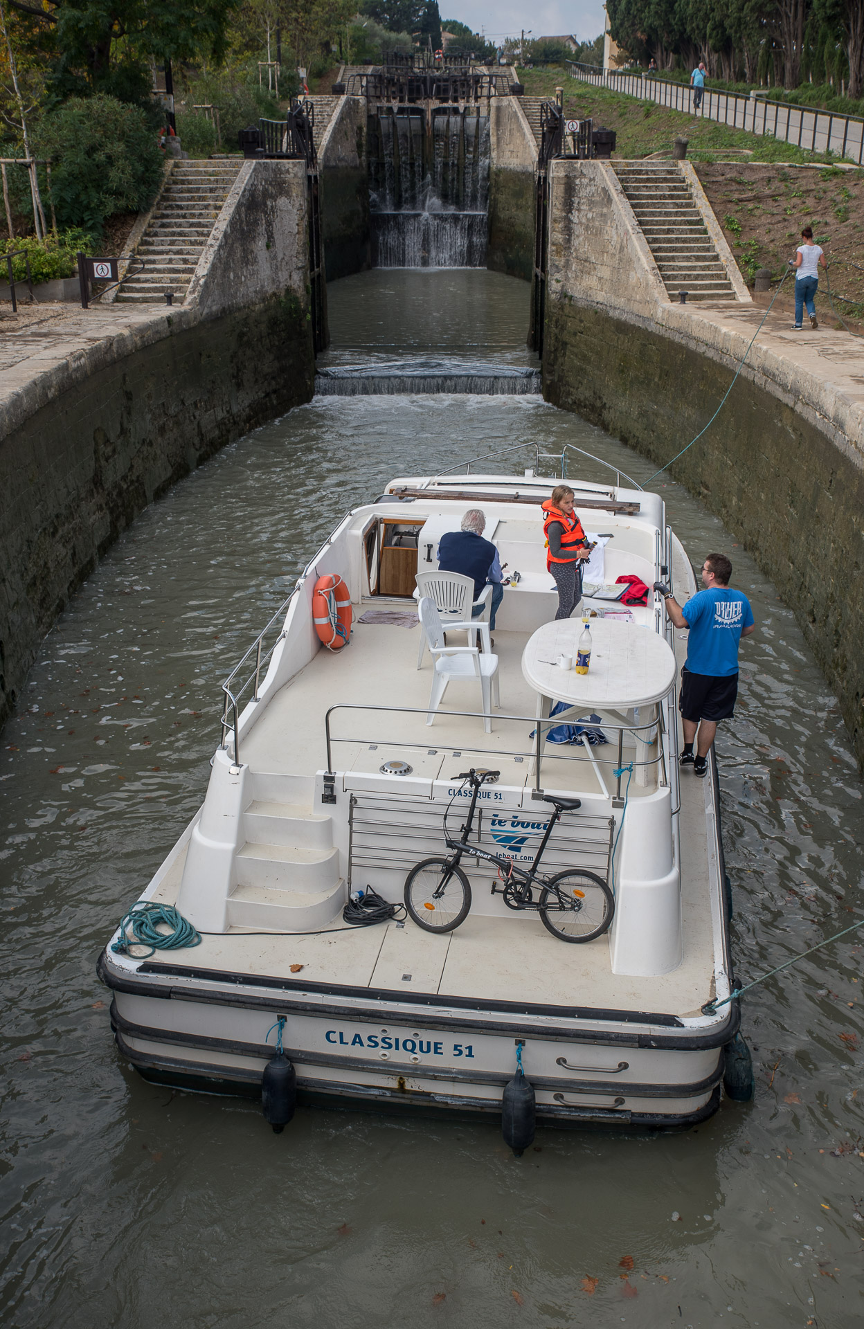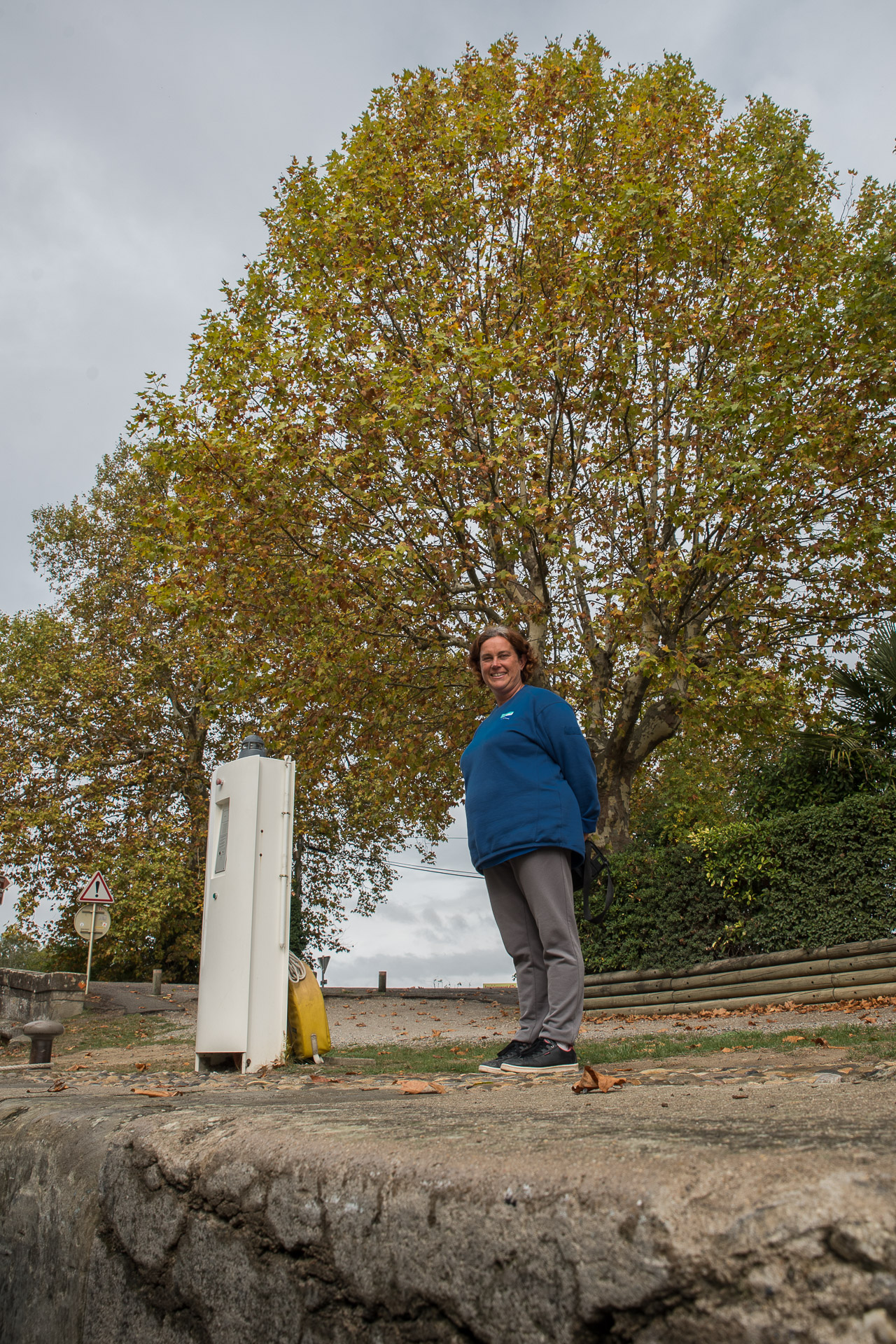 La encarga de la esclusa sonríe a los viajeros del barco que está atravesando su dominio.