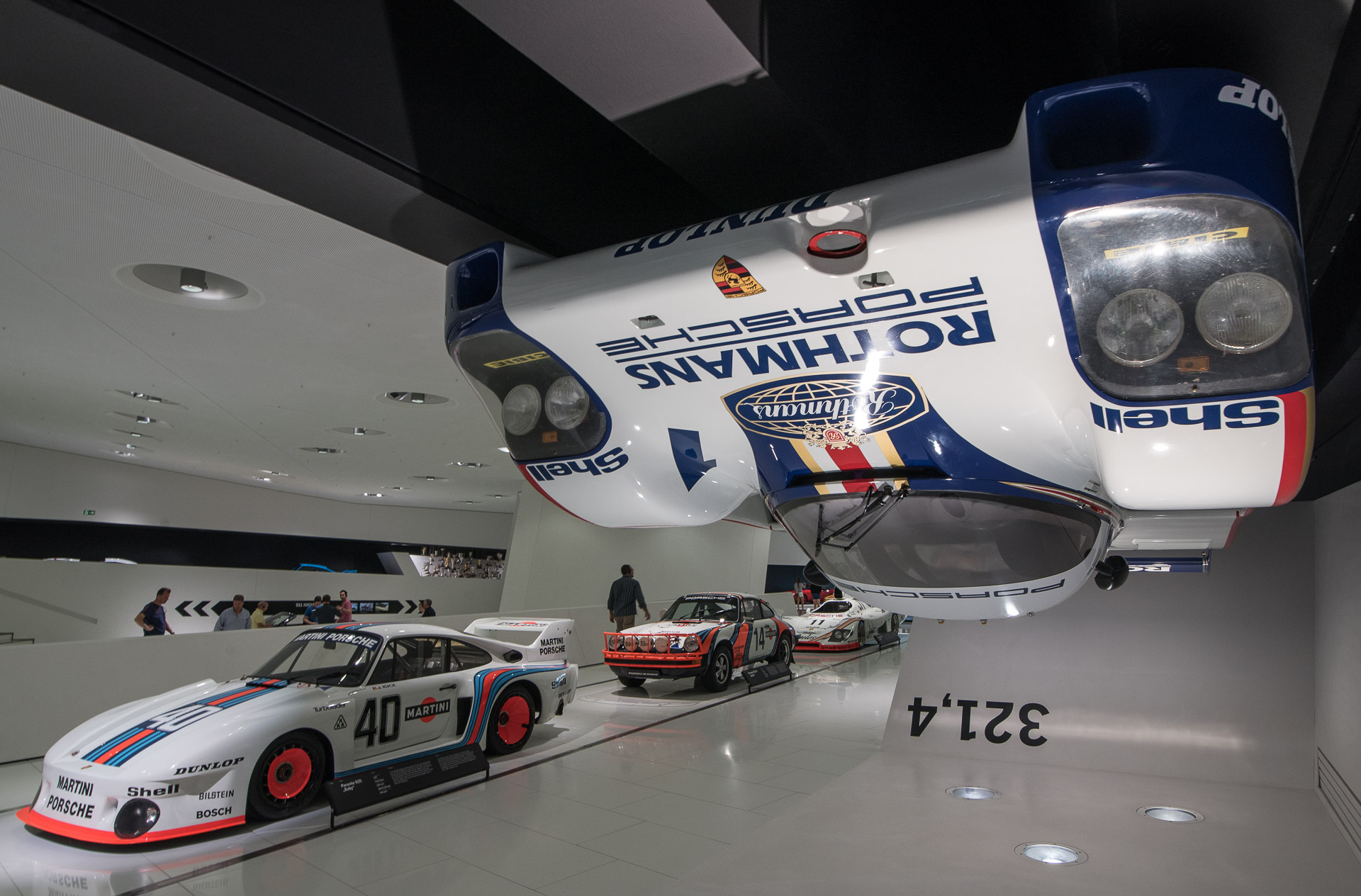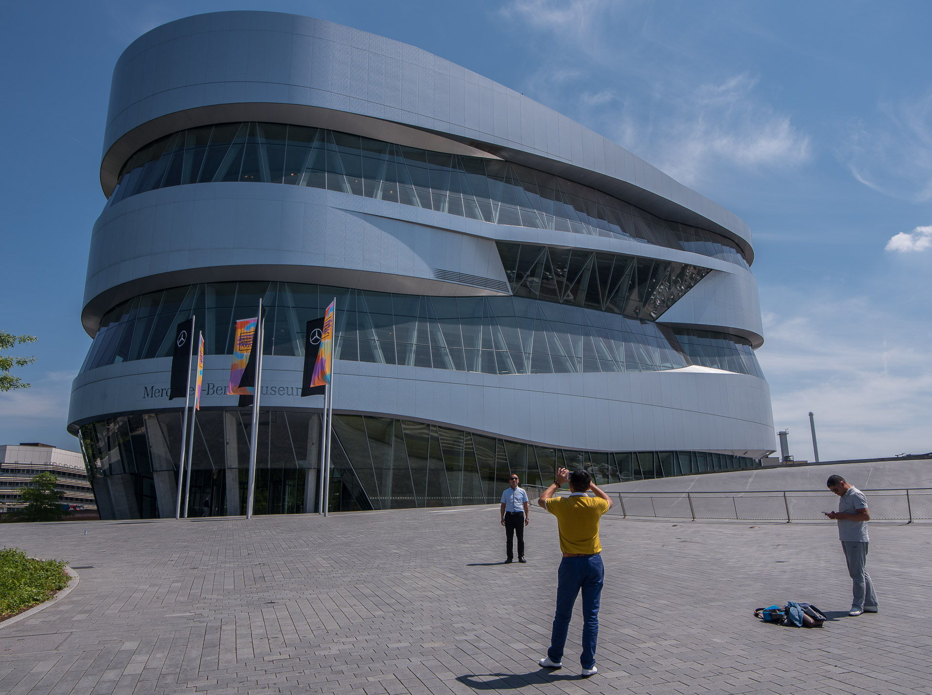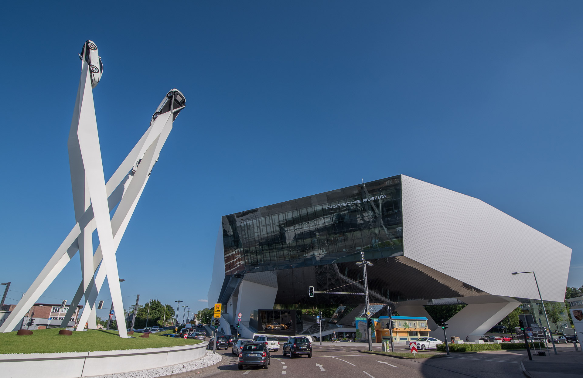 El exterior del Museo Porsche. No dejen de fijarse en la curiosa escultura de la rotonda.