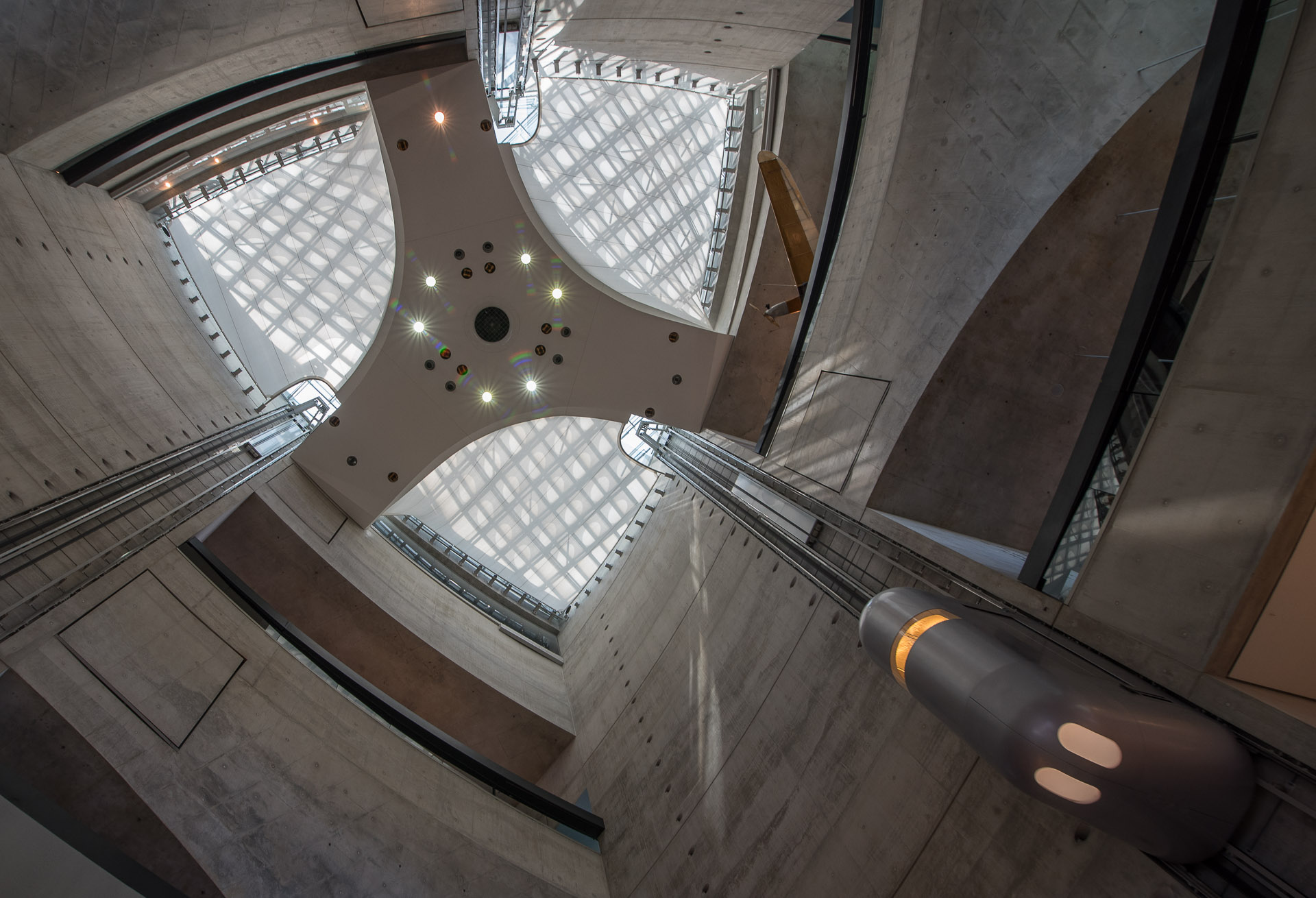 El edificio se ordena alrededor de un gran atrio interior en cuyo techo se ve la estrella de tres puntas de Mercedes