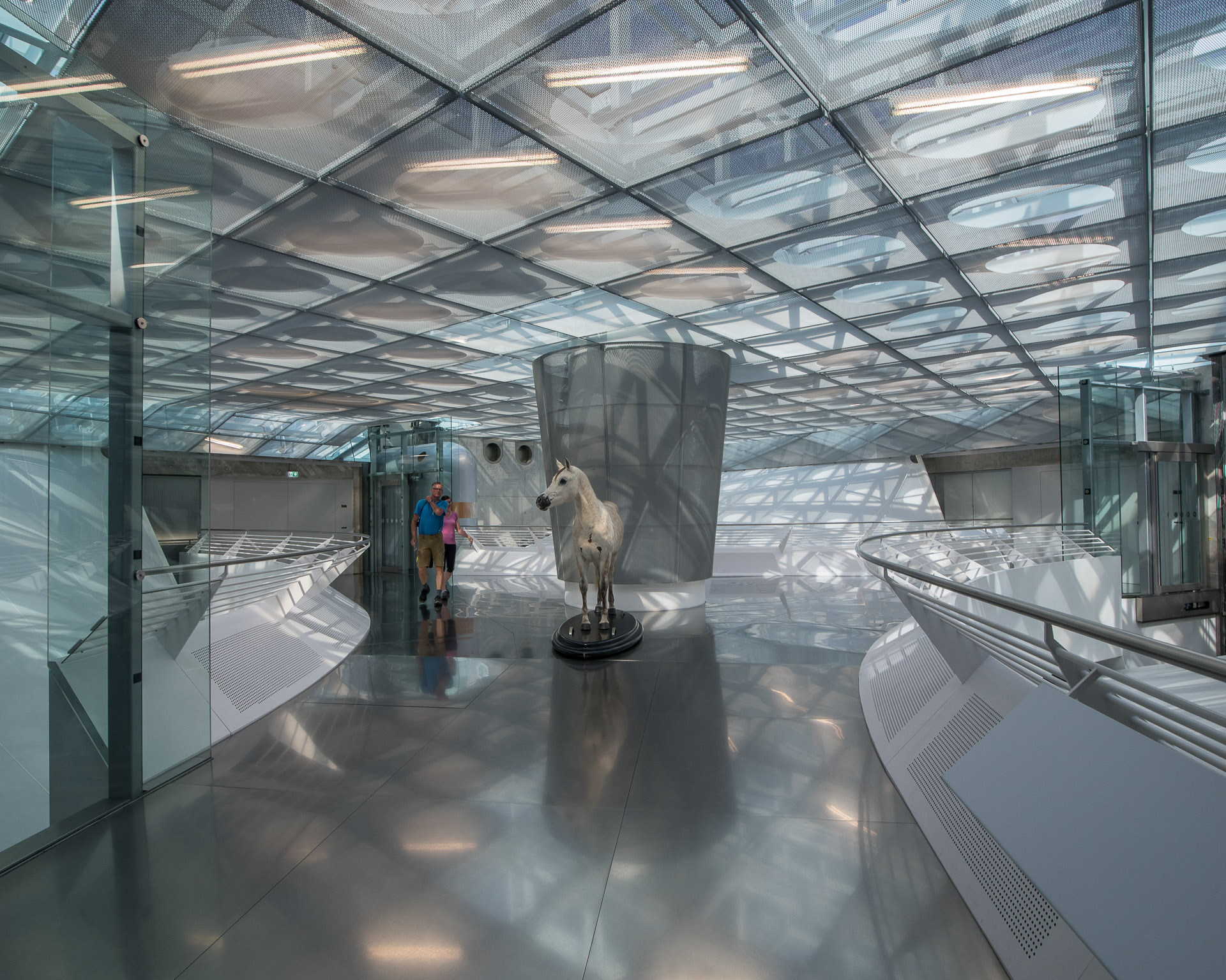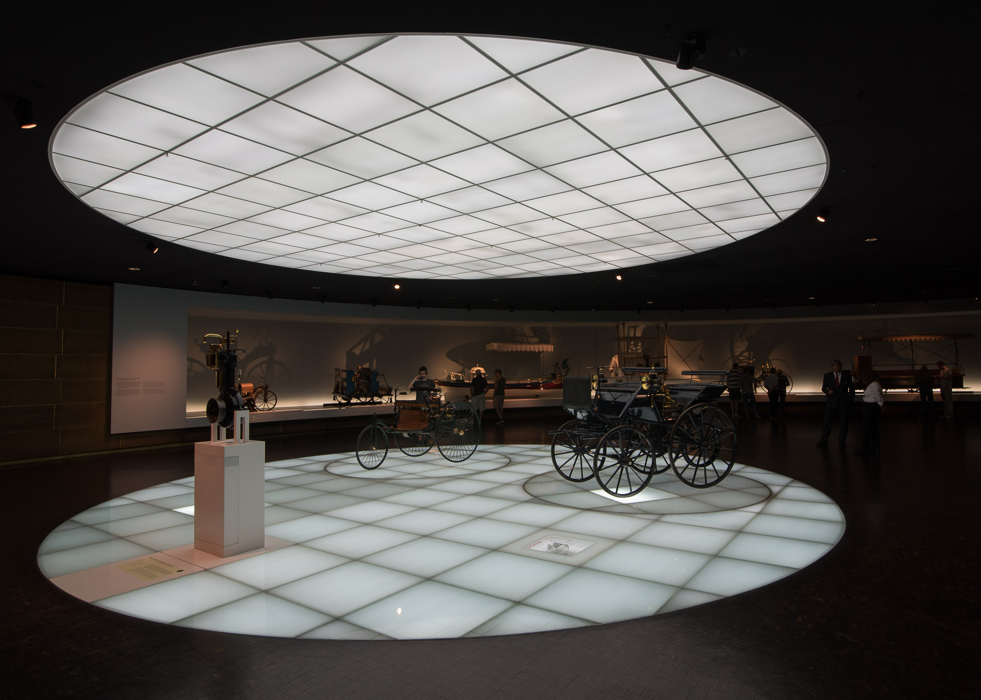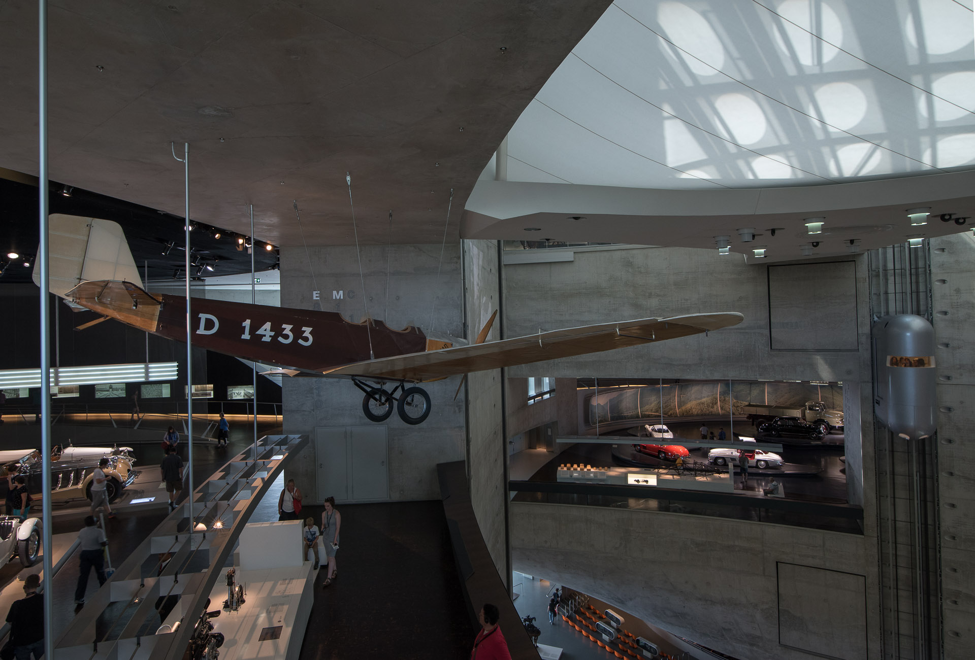 Un plano general de algunas salas del Museo Mercedes-Benz en Stuttgart, con uno de los aviones que también fabricó la firma.