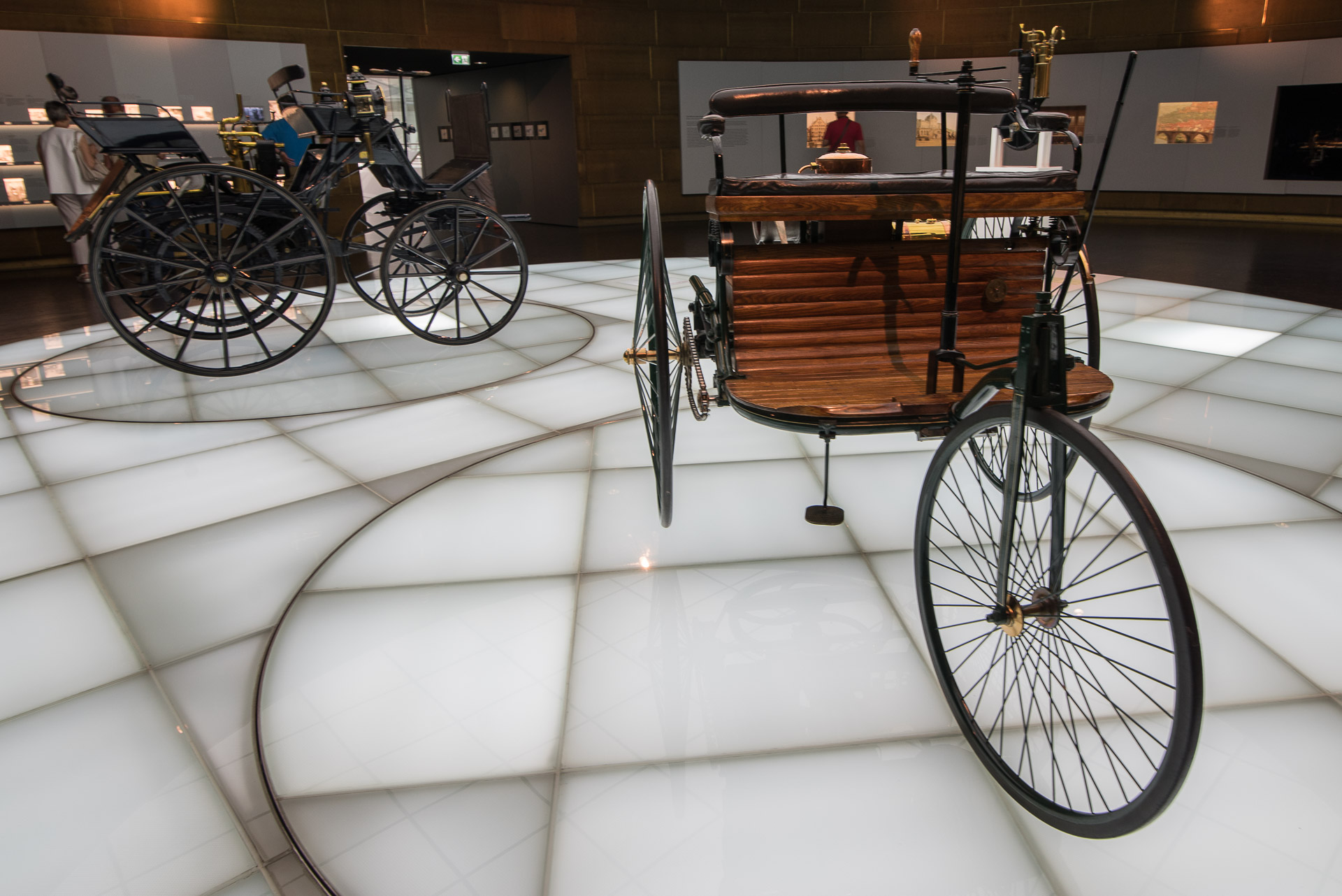 En la primera sala del Museo se pueden ver los dos vehículos creados or Daimlier y Benz en 1886.