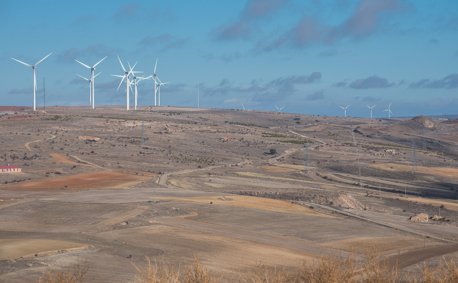 Campos y aerogeneradores desde una de las calles de Medinaceli