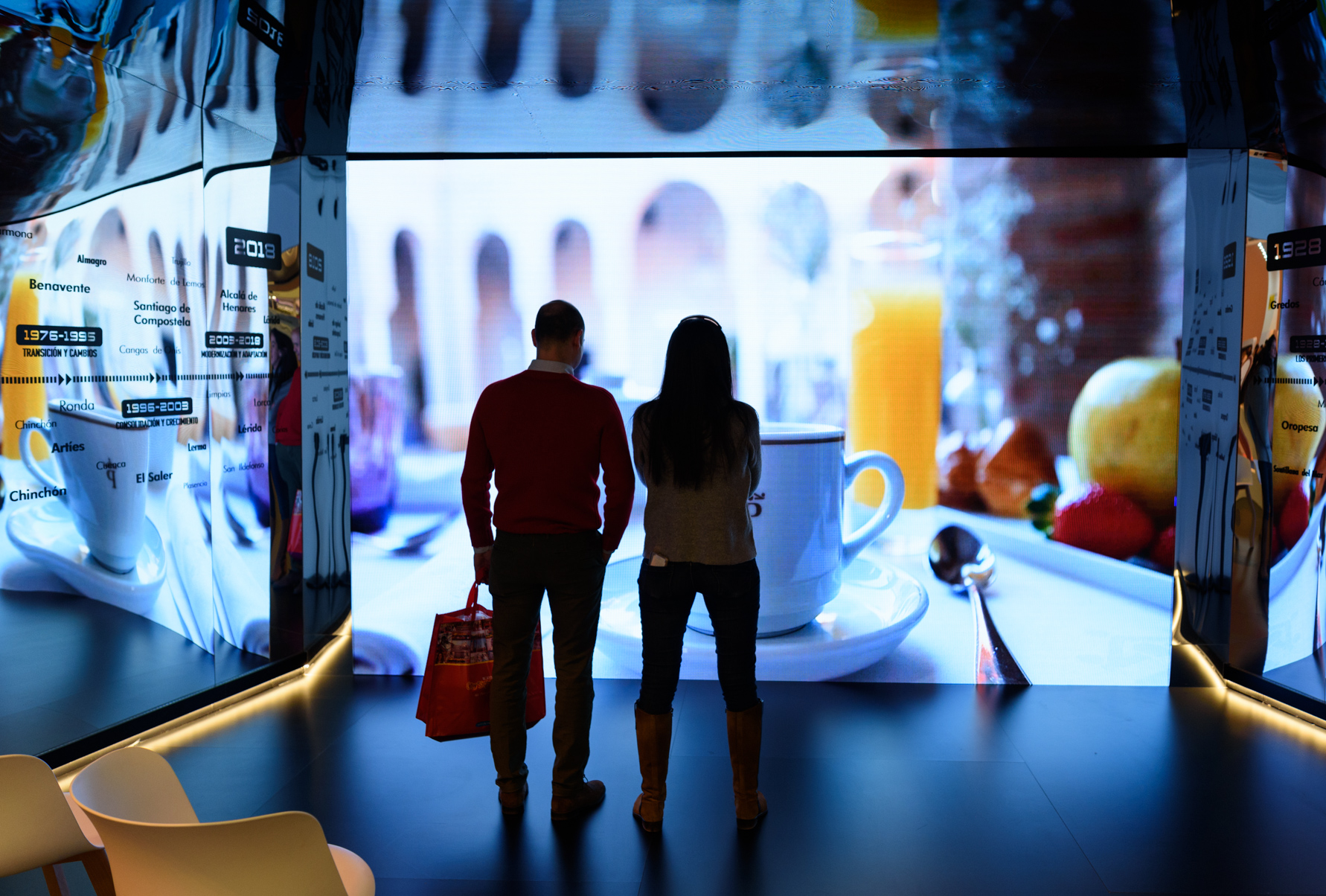 La imagen y la luz son los verdaderos protagonistas a la hora de captar la atención de los visitantes. En este caso, dos personas rodeadas de grandes pantallas en el interior del stand de Paradores.
