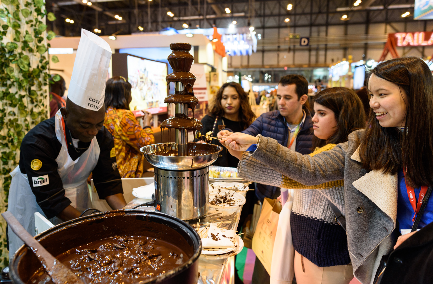 Varias personas disfrutan de una cascada de chocolate en el stand de Costa de Marfil.