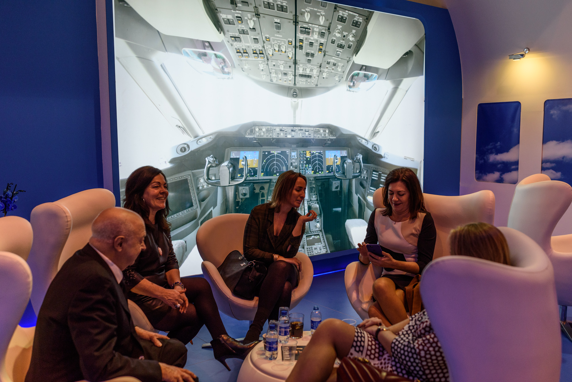 El interior del stand de Air Europa, una de las aerolíneas que se muestran en la feria, se puede disfrutar de sus cómodas butacas al mismo tiempo que da la impresión de estar en el interior de uno de sus aviones.