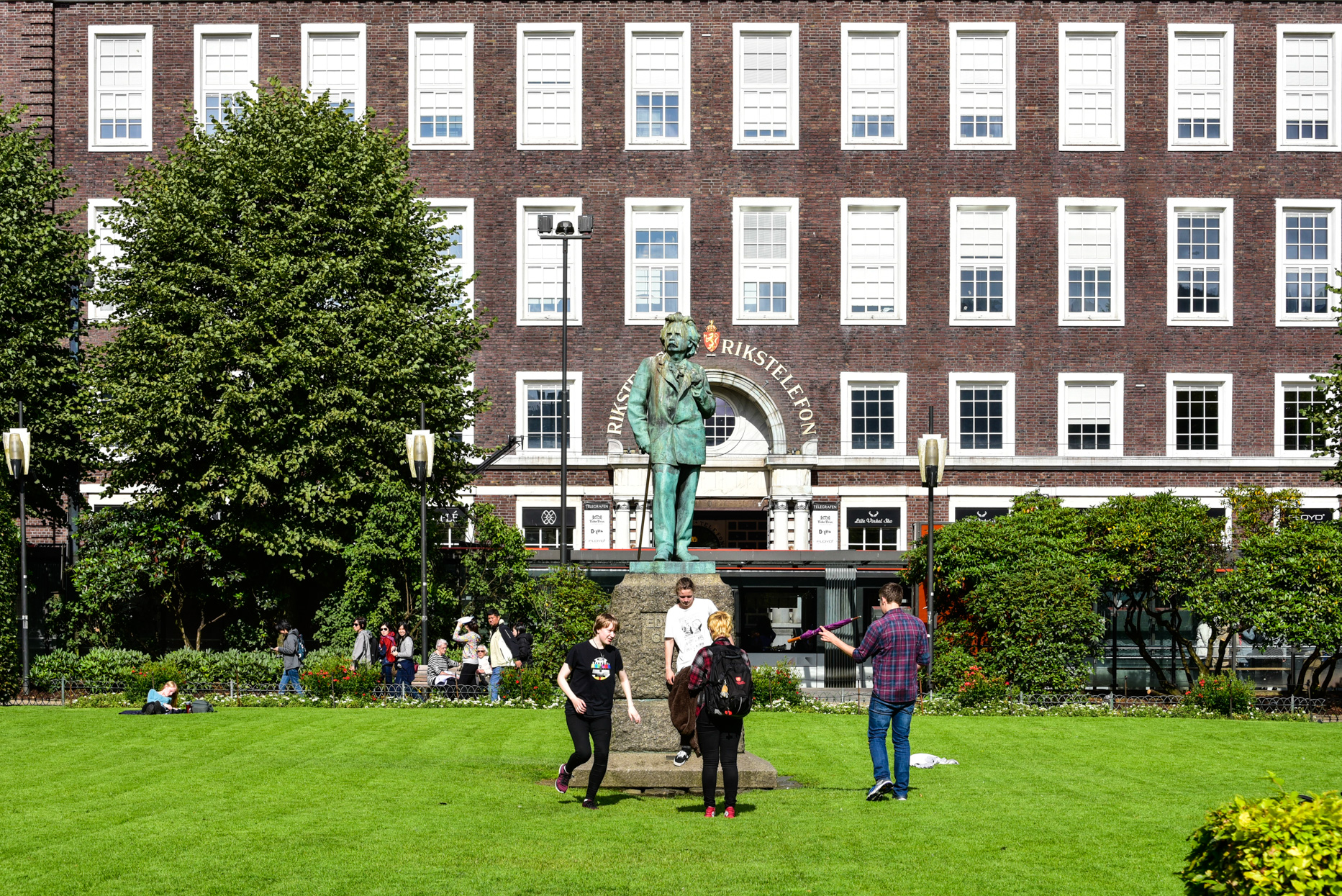 Varios jóvenes disfrutan al lado de la estatua de Edward Grieg de uno de los pocos días de sol que se pueden ver en Bergen.