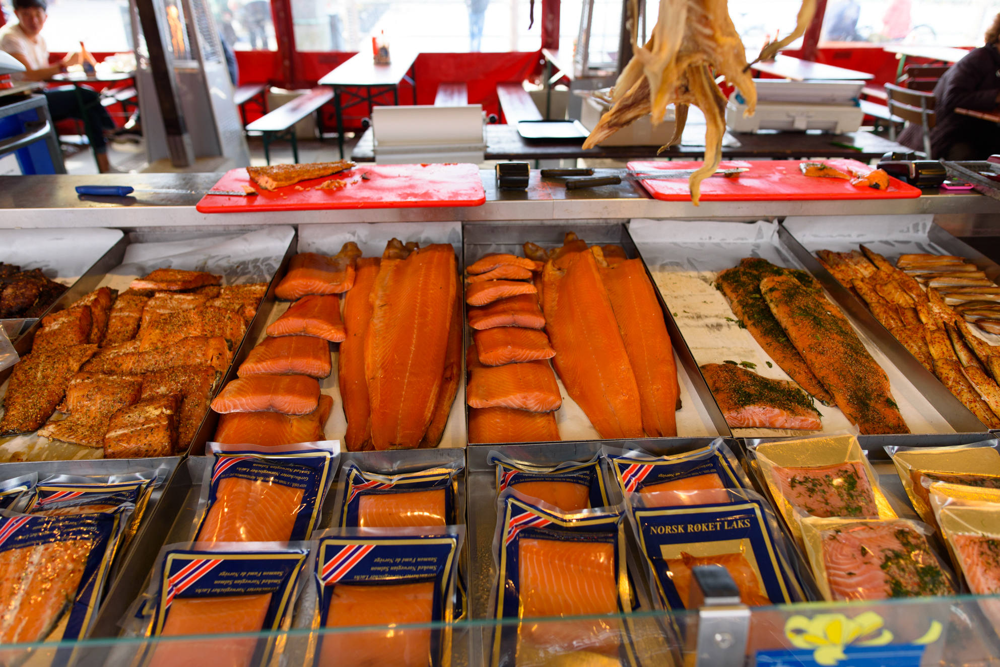 El salmón noruego, auténtico tesoro nacional, en el mercado del pescado de Bergen.