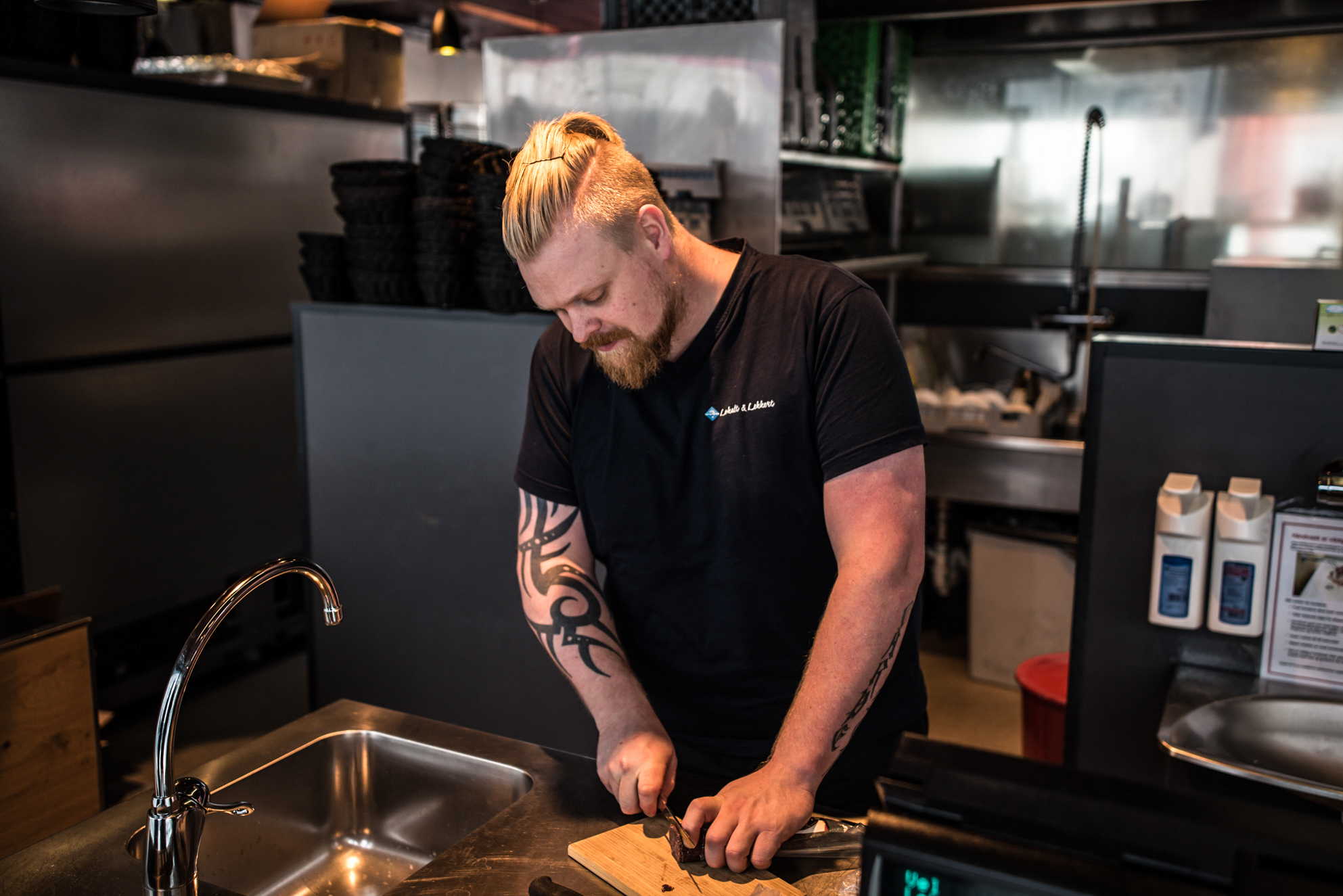 En el interior del mercado de pescado de Bergen un cocinero prepara una ración de una especie de morcilla de ballena, muy apreciada en estas latitudes.