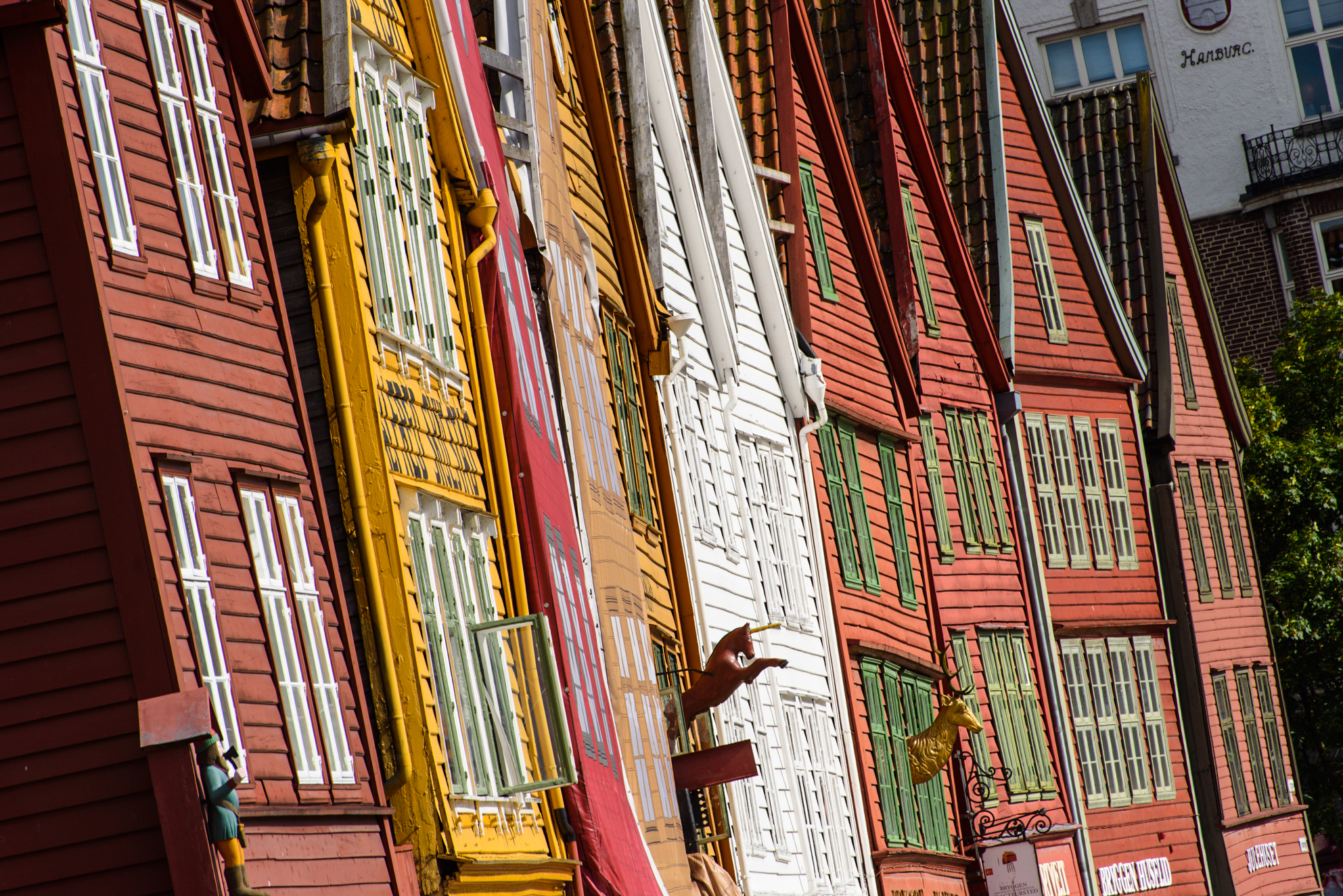 En muchas de las fachadas de las casas de Bryggen se pueden ver diferentes imágenes de personajes o animales que eran puestos sobre la puerta ya que en aquella época pocos sabían leer o escribir y recurrían a este tipo de recursos para localizarlas.