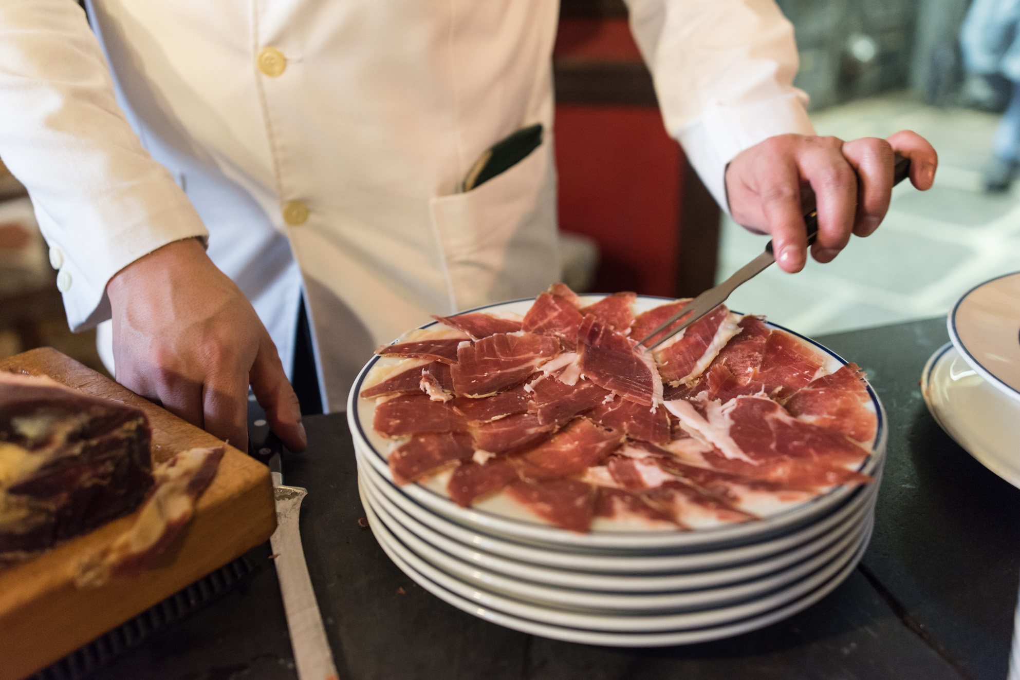Uno de los empleados del restaurante, un jabonero, prepara un suculento plato de jamón para alguno de los clientes.