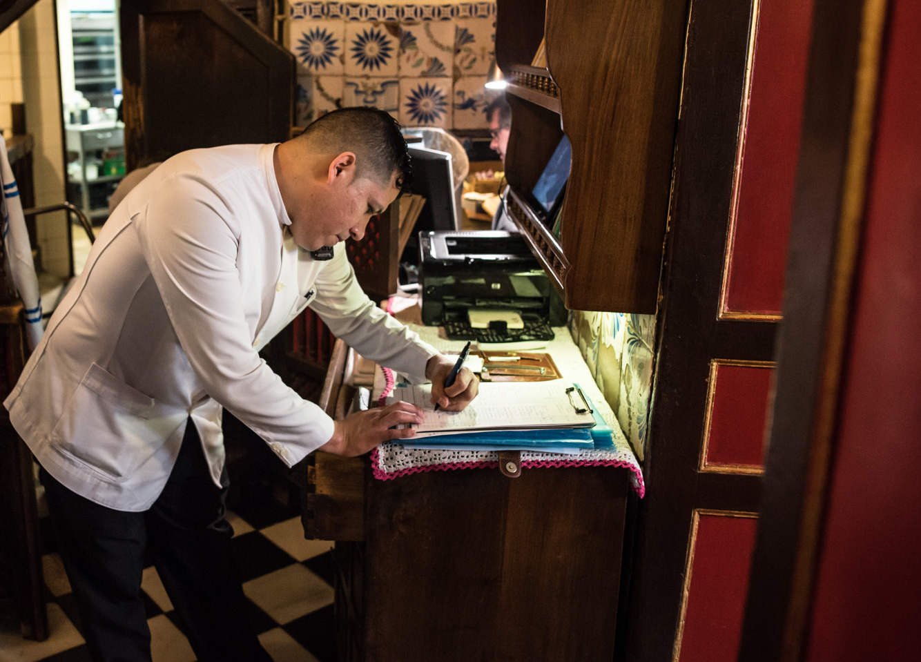 El encargado de las reservas toma nota de una petición en su libro de reservas, posiblemente uno de los documentos más importantes de la empresa.