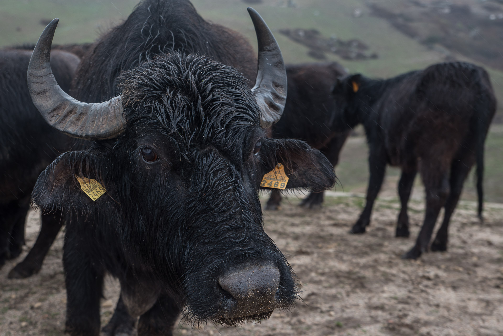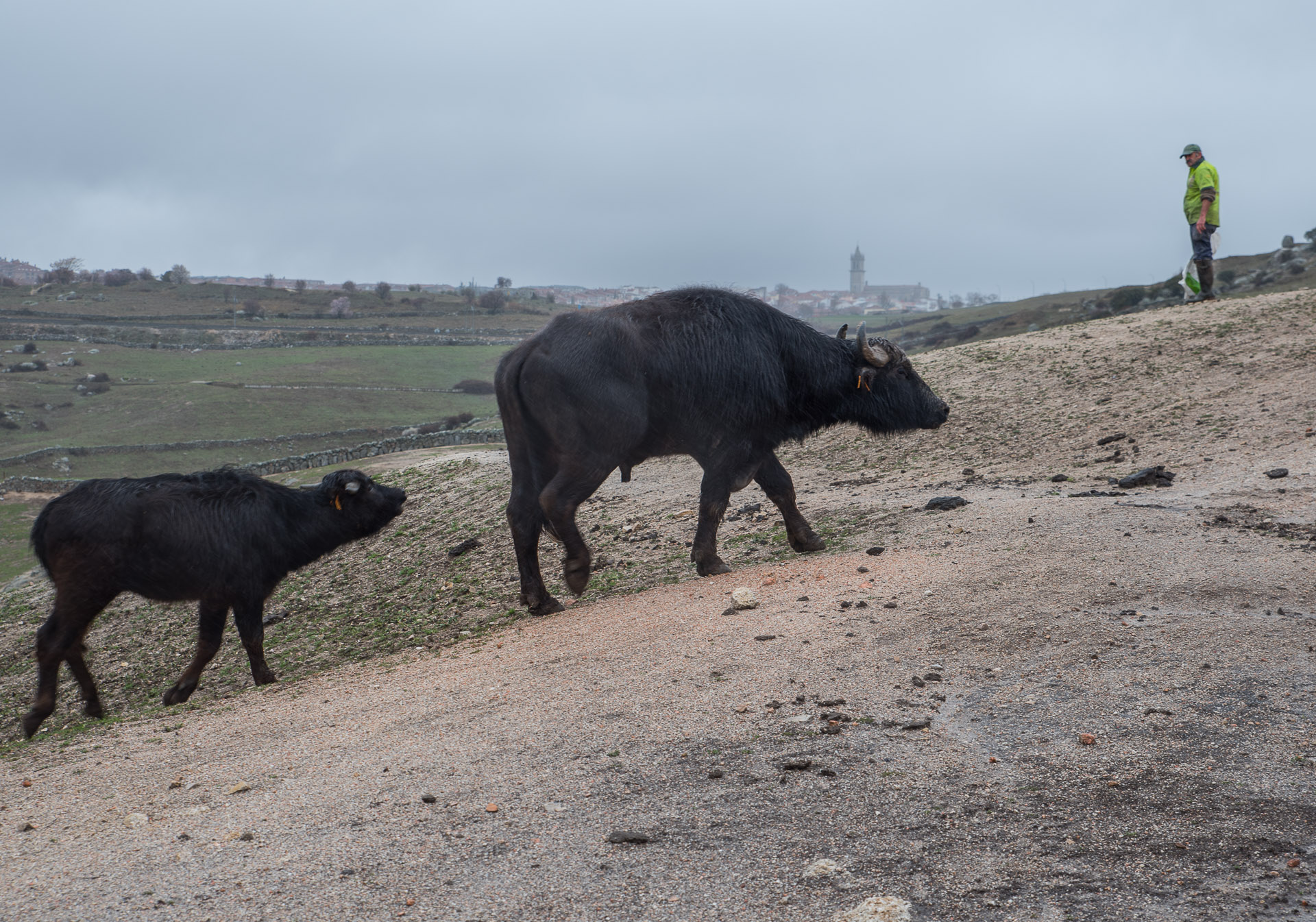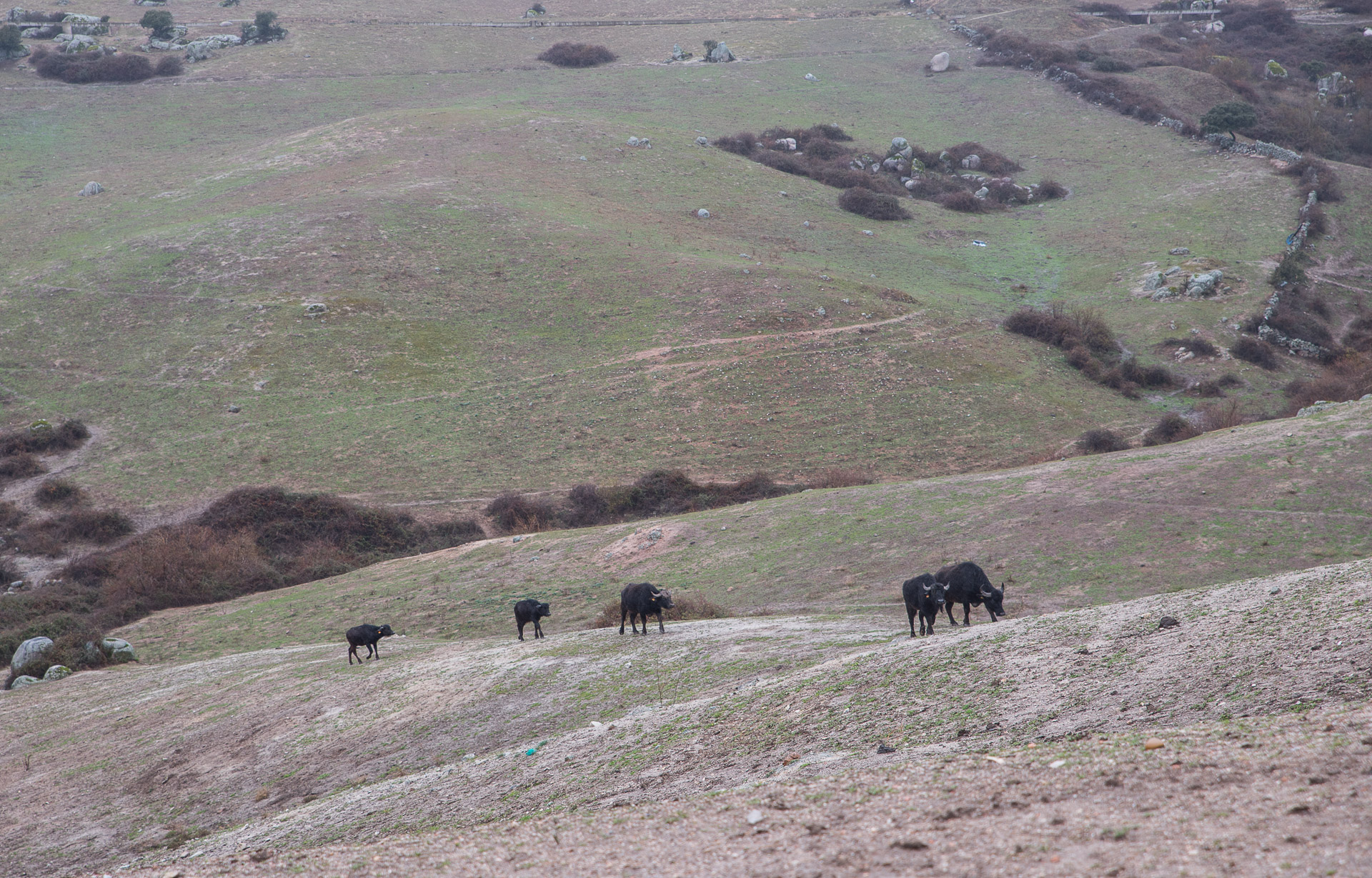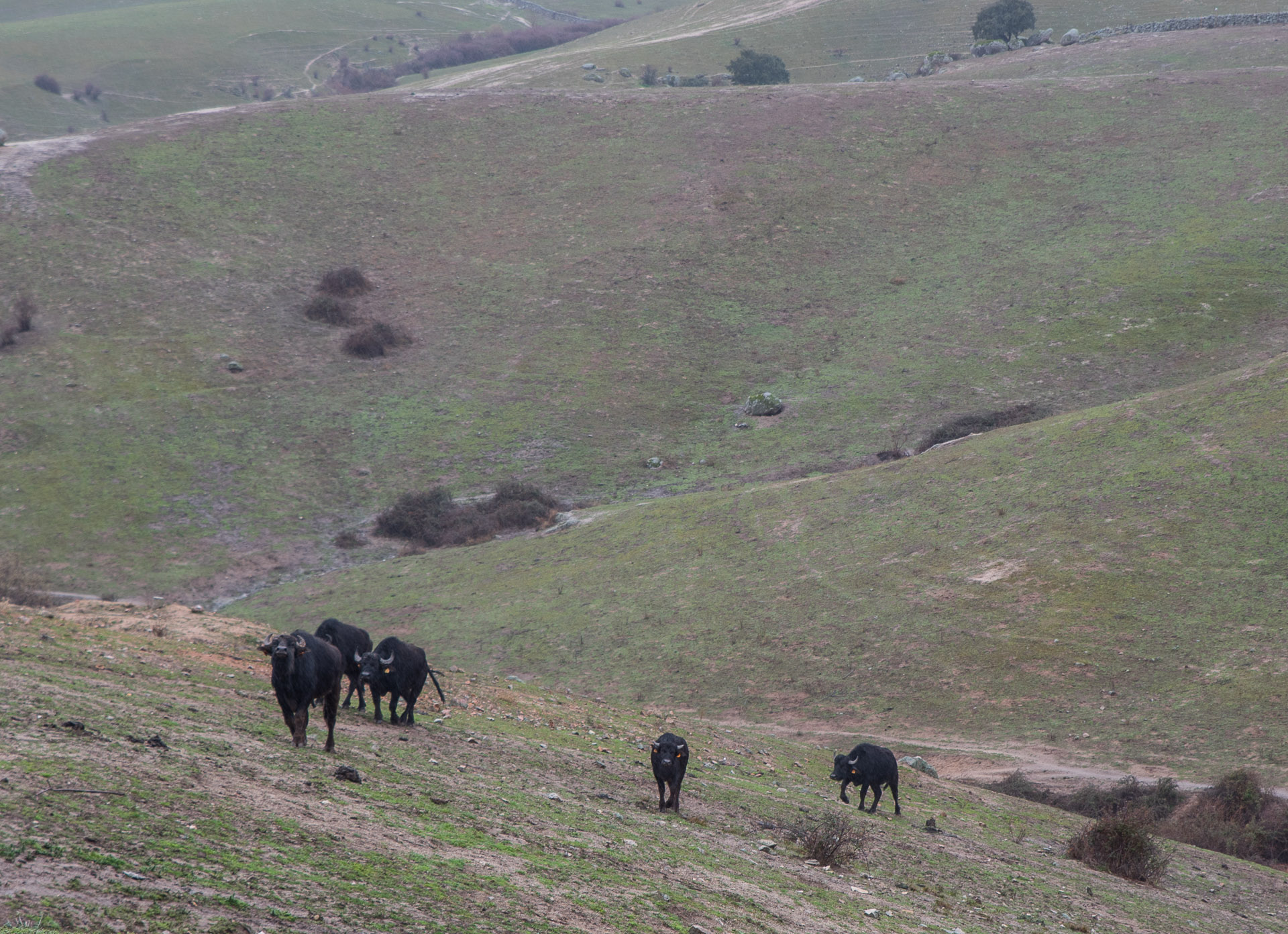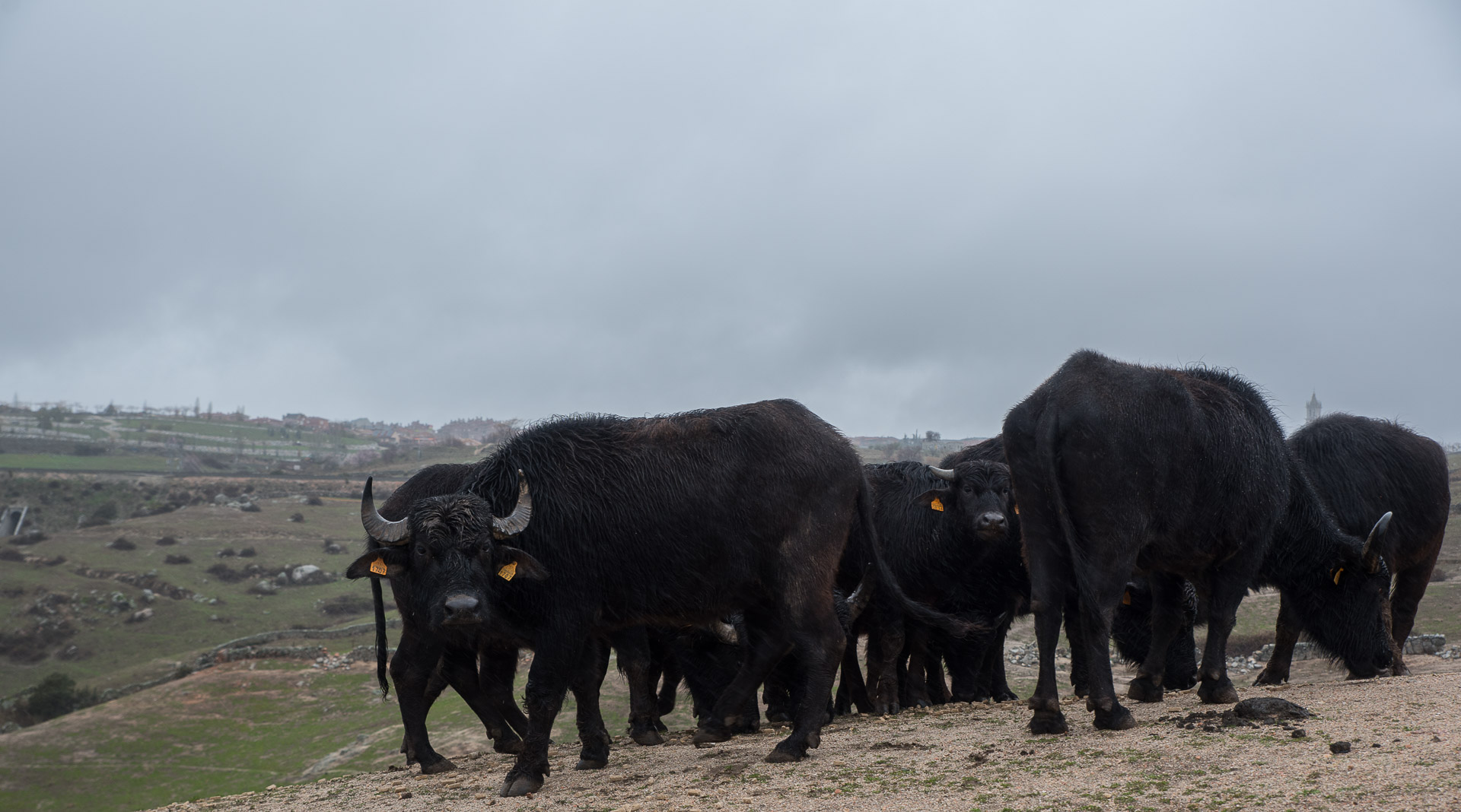 Uno de los grupos de búfalos se desplazan ladera arriba con ritmo cansino.