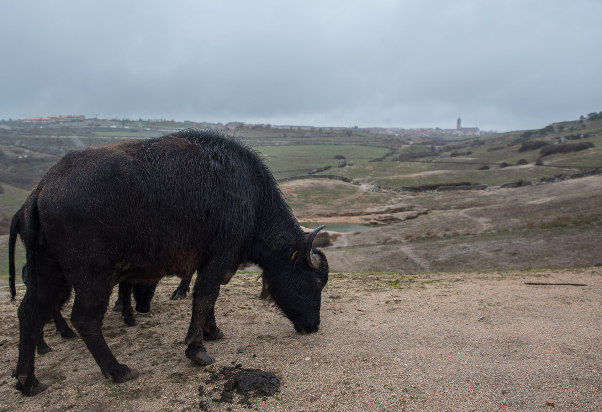 Uno de los búfalos come con las viviendas de Colmenar Viejo al fondo.