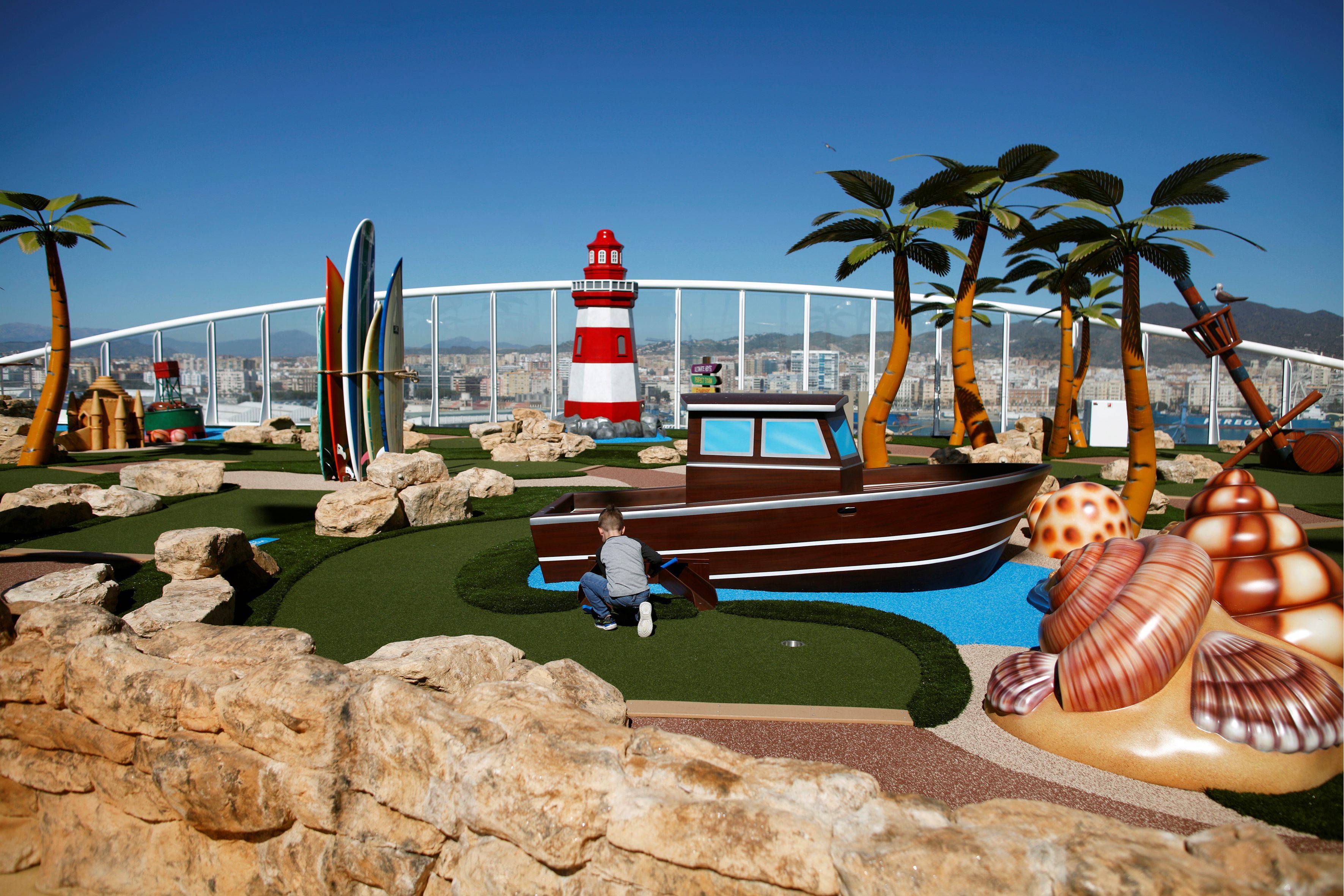 Este nuevo buque es el número 25 de la flota de Royal Caribbean y cuarto de la clase' Oasis' y realizará cruceros de siete noches por el Mediterráneo de abril a octubre. Un hombre juega al baloncesto en la cancha de este deporte que está situada sobre los camarotes del crucero.