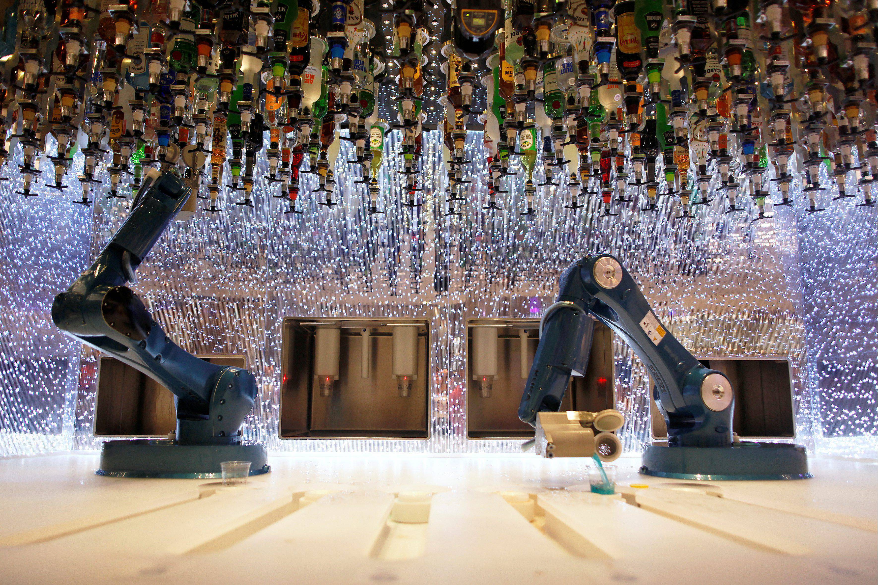 Dos robots sirven bebidas en el interior del Bionic Bar, donde dos brazos que cogen las botellas, las mezclan y sirven a los clientes.